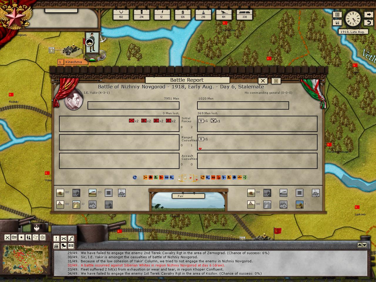 I think Pat's right about the stalemates, but this may be relevant to the question about leaders dying: before we started our PBEM game, I played a test game and ran the first turn a few times against the AI to practice my opening moves; every time I ordered Bishkelaurov to assault Grozny, he died while his troops took relatively light losses. I just thought it was a fluke or the result of a random seed number that was prefigured for turn one, but he died assaulting Grozny in our PBEM too, which was a new game. Could be a coincidence, could be armoured trains are just really good at sniping generals leading infantry during siege assaults, who knows, but I thought it worth mentioning.