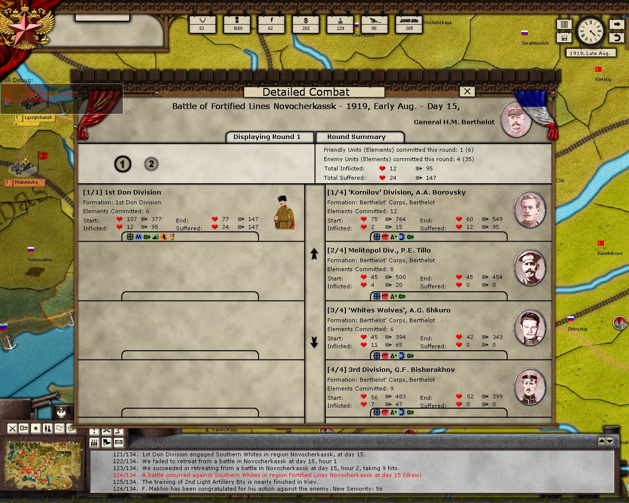 Late August 1919: Red morale 83, Siberians 85, Southern Whites 76. The French have suddenly decided to take a very active hand in the war: four French divisions assaulted the fortified lines at Novocherkassk (though they appear to have been made up of at least half Russian troops) while an actual French division attacked Donetsk. Another French column had a brush with partisans in the Amur region. Stalin is besieging Rostov – I’ve got to figure out if I want to call him back to Novocherkassk to support the garrison there. Northern Front is moving slowly towards Odessa. Trotsky takes Ufa, while the Komuch forces launch an attack on the fortified lines in Samara. The Iron Division will zip back down the rail line to protect Samara. Northern Front has finally cleaned up the Pskov forces – I think it’s time to go after the Balts. Four requisition and three recruiting missions completed. Three subversion missions cancelled, even though the Whites still hold the capitals of all three provinces. I wonder why? Maybe its because I had no money at the beginning of the turn though after the requisition missions got done I had plenty.