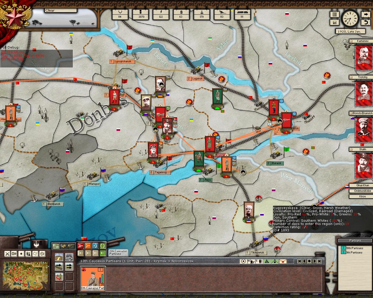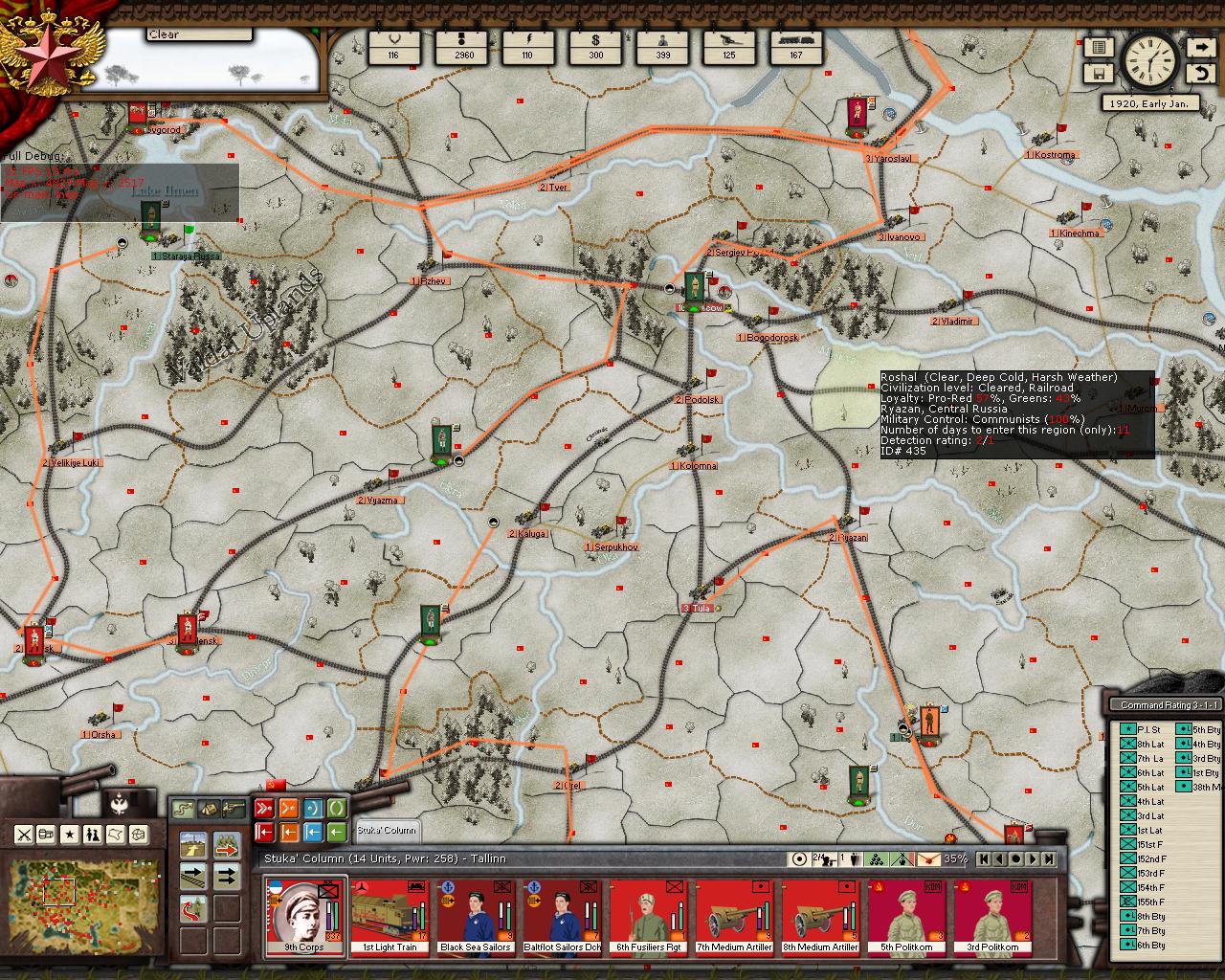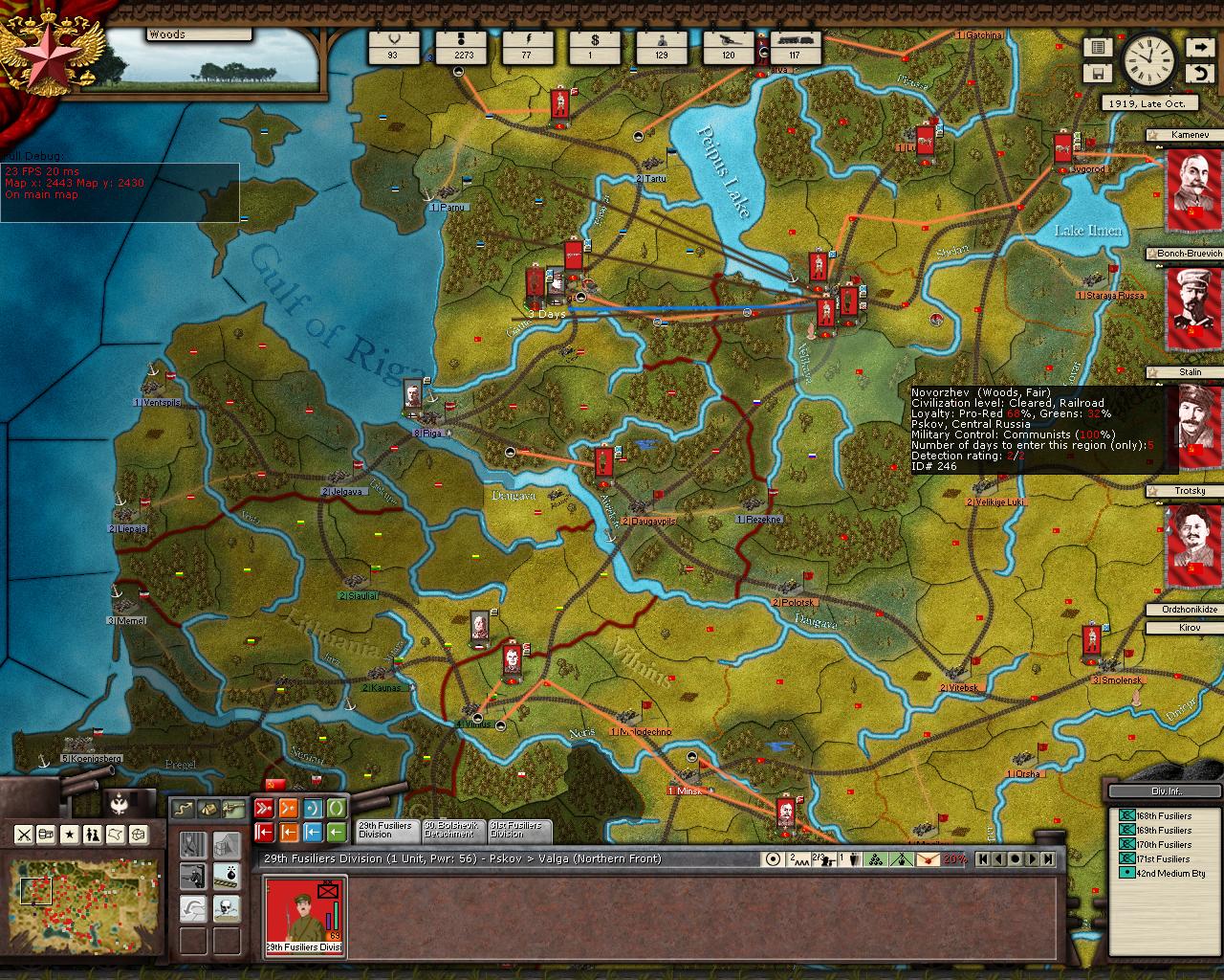 I played the Reds, starting under 1.01rc3 and installing patches as they came out. I started writing this AAR about halfway through, with the July, 1919 turn, using the “restore previous turn” option to go back, so I don’t have complete data on the earliest turns. But I’m trying to recreate my thinking at each step so other players can see how the game developed.
