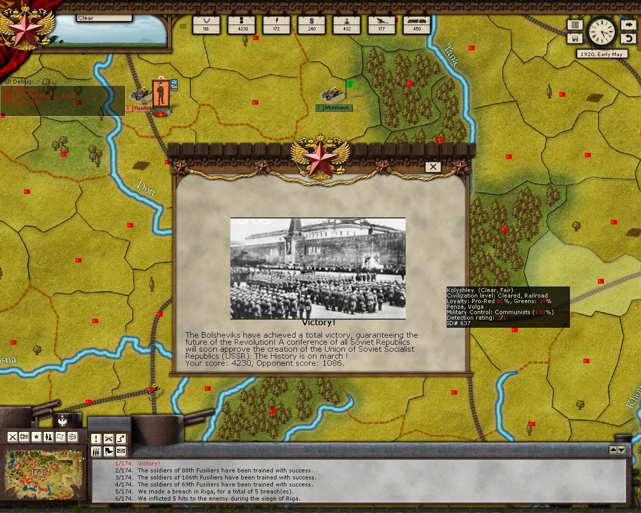 Late June, 1919: Red morale 90, Siberians 88, Southern Whites 80. Siberian front trying to link up with small forces around Viataka, hopes to go on to Perm. Northern Front reorganizing at Pskov after a victory over the small White force to the east of the town, small White garrison besieged inside the town. We captured six supply wagons from the Whites in the battle last turn, sending them about the country to build depots to strengthen the supply delivery network. Budenyy to pursue Green force retreating from Kiev. Building units for fort for Kiev in Kursk. Two new divisions from Tambov to Ekaterinoslav with materials for a fort there; those units to move towards Donetsk once the fort is built. Stalin detaches Frunze’s division to attack Lugansk. Kirov moves from Aralsk down to Tashkent to try to restore the situation there after the death of Zinoviev. Guerillas wandering about the Kuban and in vicinity of Tomsk have smashed rail lines, in both cases Whites are slow to repair them. A Red partisan unit has been in Azov for three turns unmolested. If they leave me there one more turn, I’ll be able to move my captured naval transport unit away! Three requisition, two Cheka, and one subversion missions completed this turn. We are now building a tank factory in Petrograd.