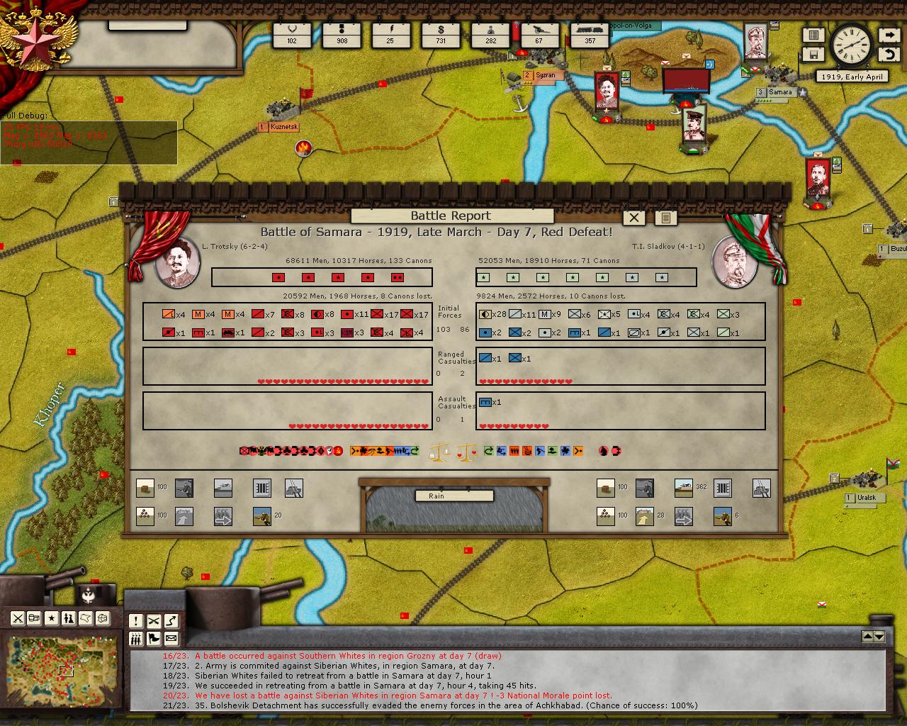 Early April, 1919. Red morale 102, Southerners 115, Siberians 98. Resources 25 EPs, 731$, 282 companies, 67 WS. Four requisition, three recruiting, and six subversion missions complete. Trotsky turned back from Samara with heavy losses. Here's a picture: