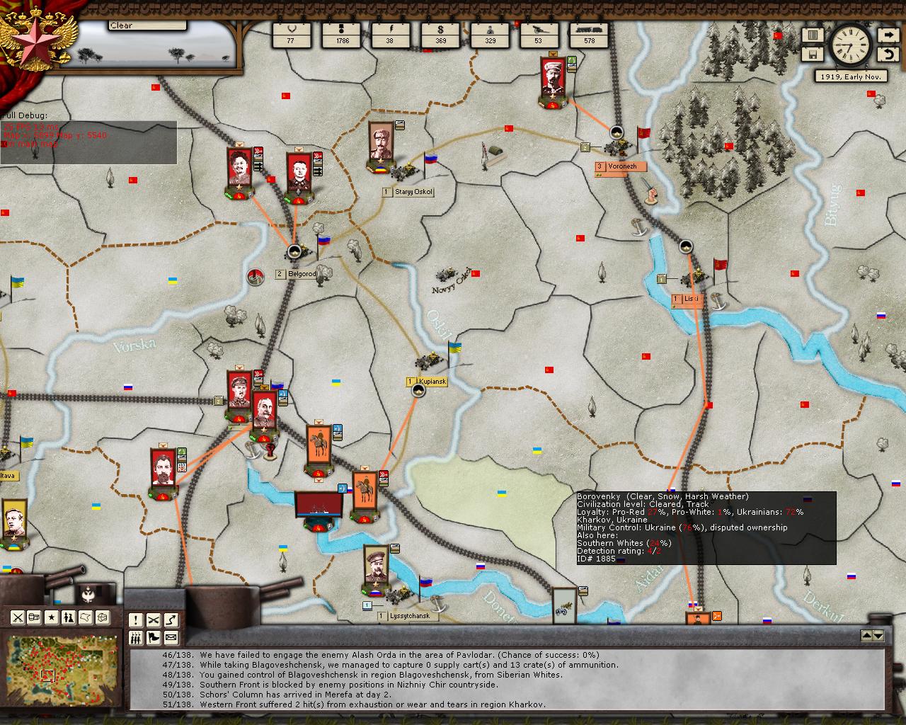 Early November 1919. Allied involvement 0, Red morale 77, Southerners 117, Siberians 83. Resources 36 EPs, 369$, 329 companies, 53 WS. Two requisitions complete. Whites finally take Khabarovsk, using a column of Czech infantry! What are they doing out there? Their country has been independent for a year! There is also a Japanese division in Khabarovsk, though they didn’t attack me. At least the British are gone from Ashkhabad. The Southern whites attacked out of Belgorod at Staryy Oskol, pushing Northern Front back towards Voronezh but suffering 8000 casualties themselves. Looking at the scouting report for their units they appear to be up to full strength and packing about 1100 strength points. Trotsky and Tukachevsky have about 1800, they’re going to take Belgorod and wait for the whites to come back. They don’t appear to have any source of supply in the neighborhood though that is not so much of an obstacle in this game as it is in other AGEOD titles.