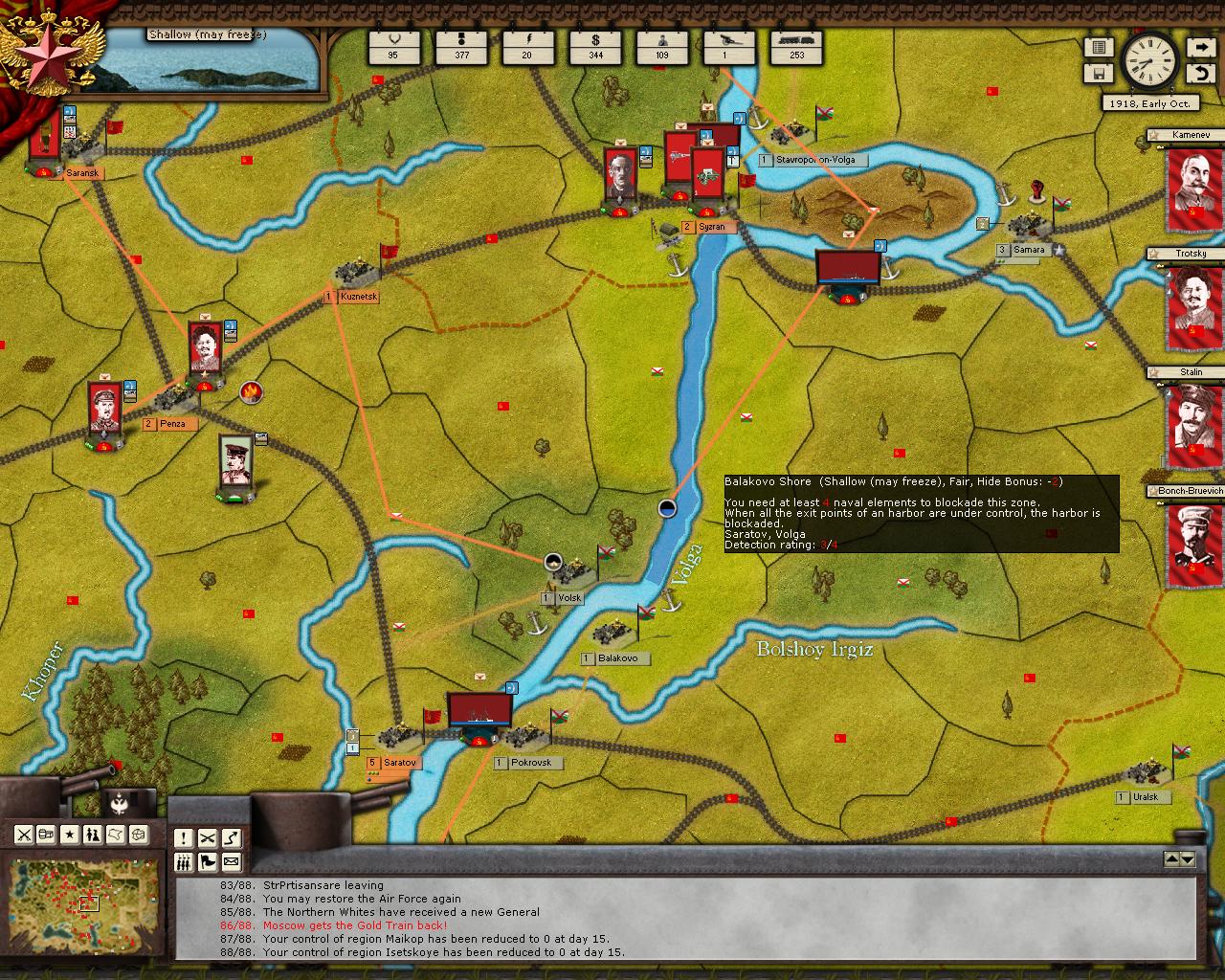 :Late September, 1918. Allied intervention 8, Red morale 94, Southerners 105, Siberians 104. Resources 15 EPs, 36$, 210 companies, 39 WSU. Southern Whites take Ekaterinodar and now have a capital, as anticipated. Stalin’s assault on Penza unsuccessful. Now, it’s Trotsky’s turn. Makhin will come from the west with the 25th Fusiliers and Chapaev, so we get the pincer effect. Tukachevsky deploys to Vologda, takes command of a division there, and proceeds down the Don to cut off supplies to the variety of White units that are roaming about between the Volga and the Don. Far East partisans head for Chita. If I can get it, another requisition.