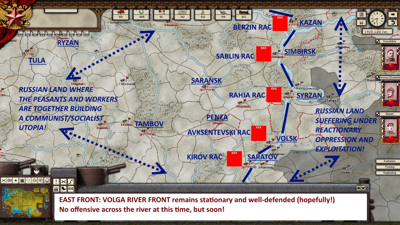 Ripster8 wrote:The eastern whites have been very quiet - some gathering of forces along the Volga but nothing threatening. Good for the Reds!