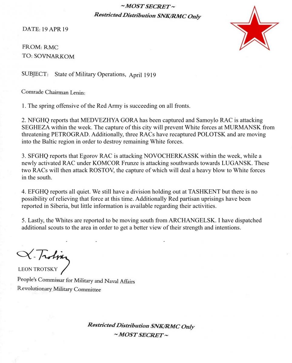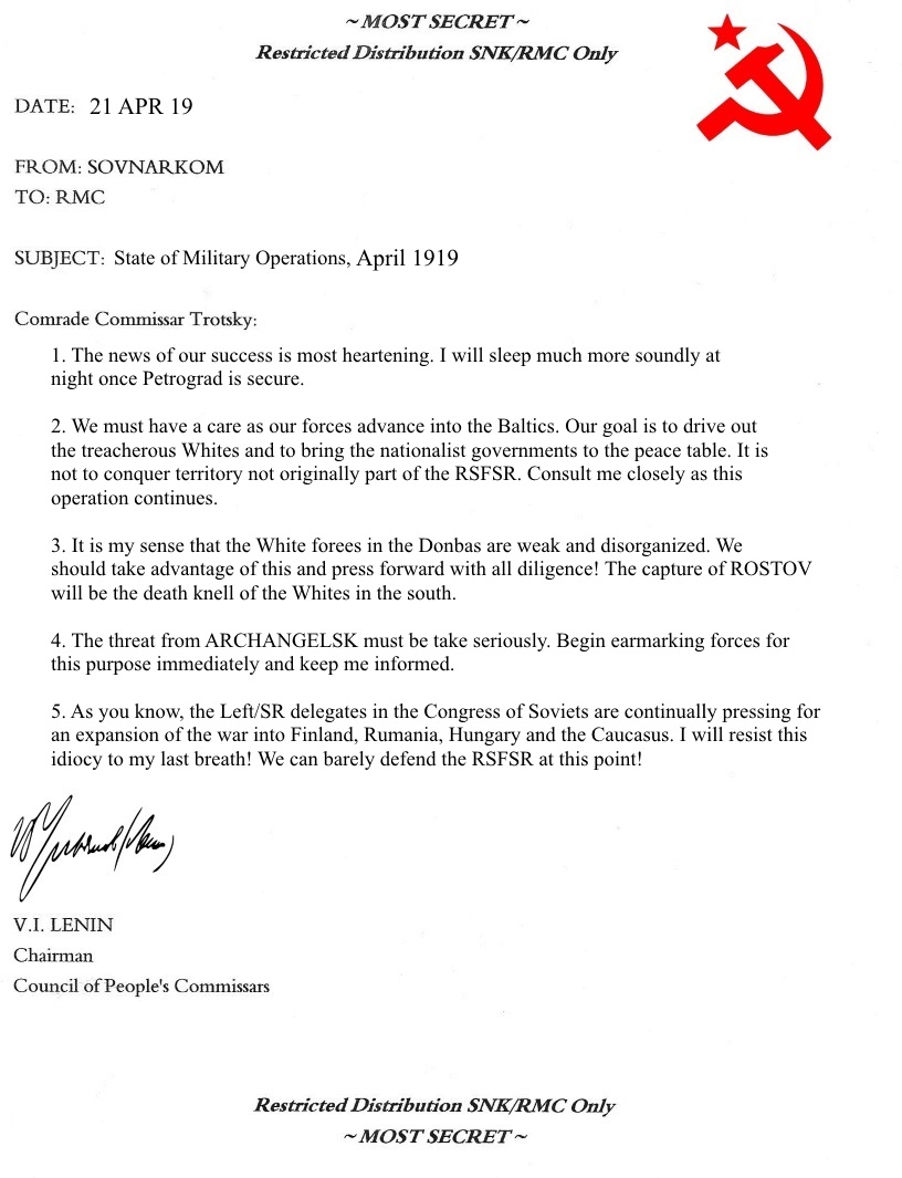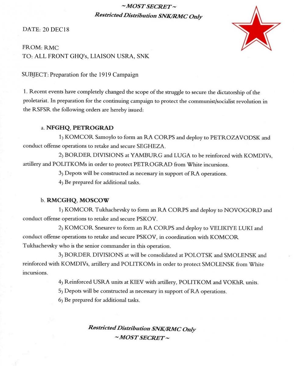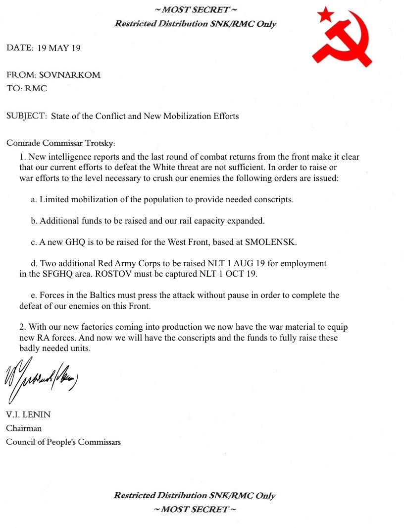 Comrade Chairman Lenin arrived at RMC HQ the evening of December 20, 1918. He had not received the RMC's orders implementing the JPC campaign plan for 1919. Trotsky's secretary quickly ushered Lenin into the commissar's office. Trotsky lay hunched over his desk, snoring loudly.