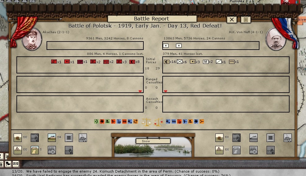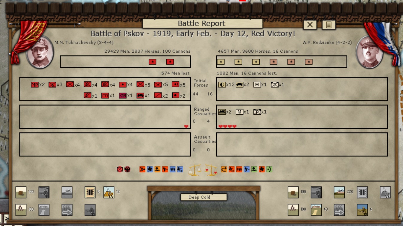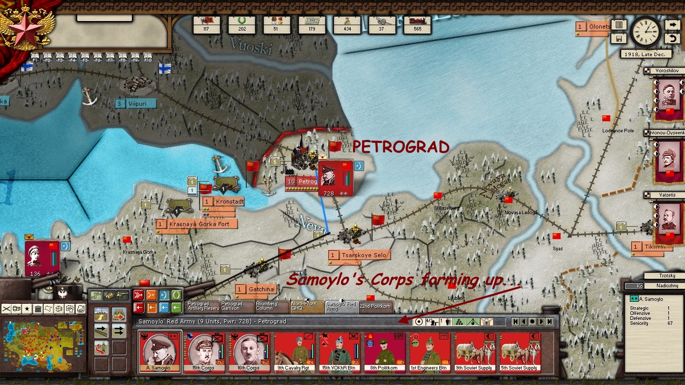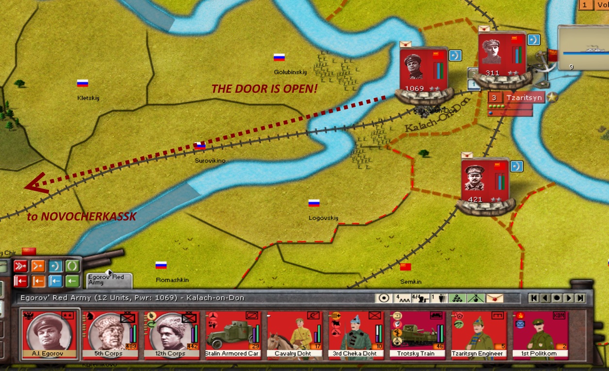 - Tukachevsky, Snesarev and Samoylo arrive at their forward staging positions, but there have been some losses due to harsh weather. Armored trains are being deployed forward to these Corps and to the Corps of KOMCOR Egorov near Tzartisyn, in hopes of improving the flow of supplies.
