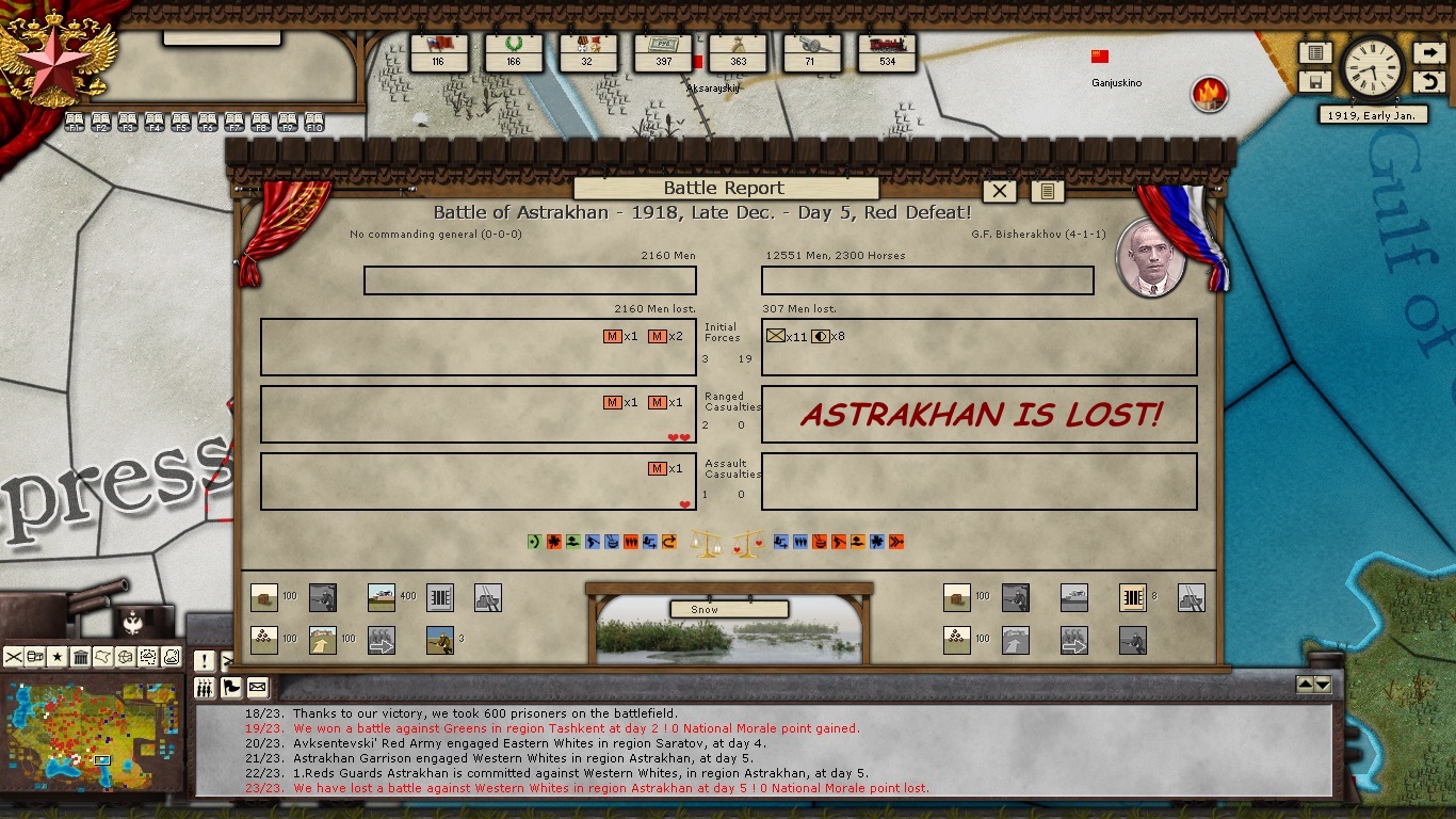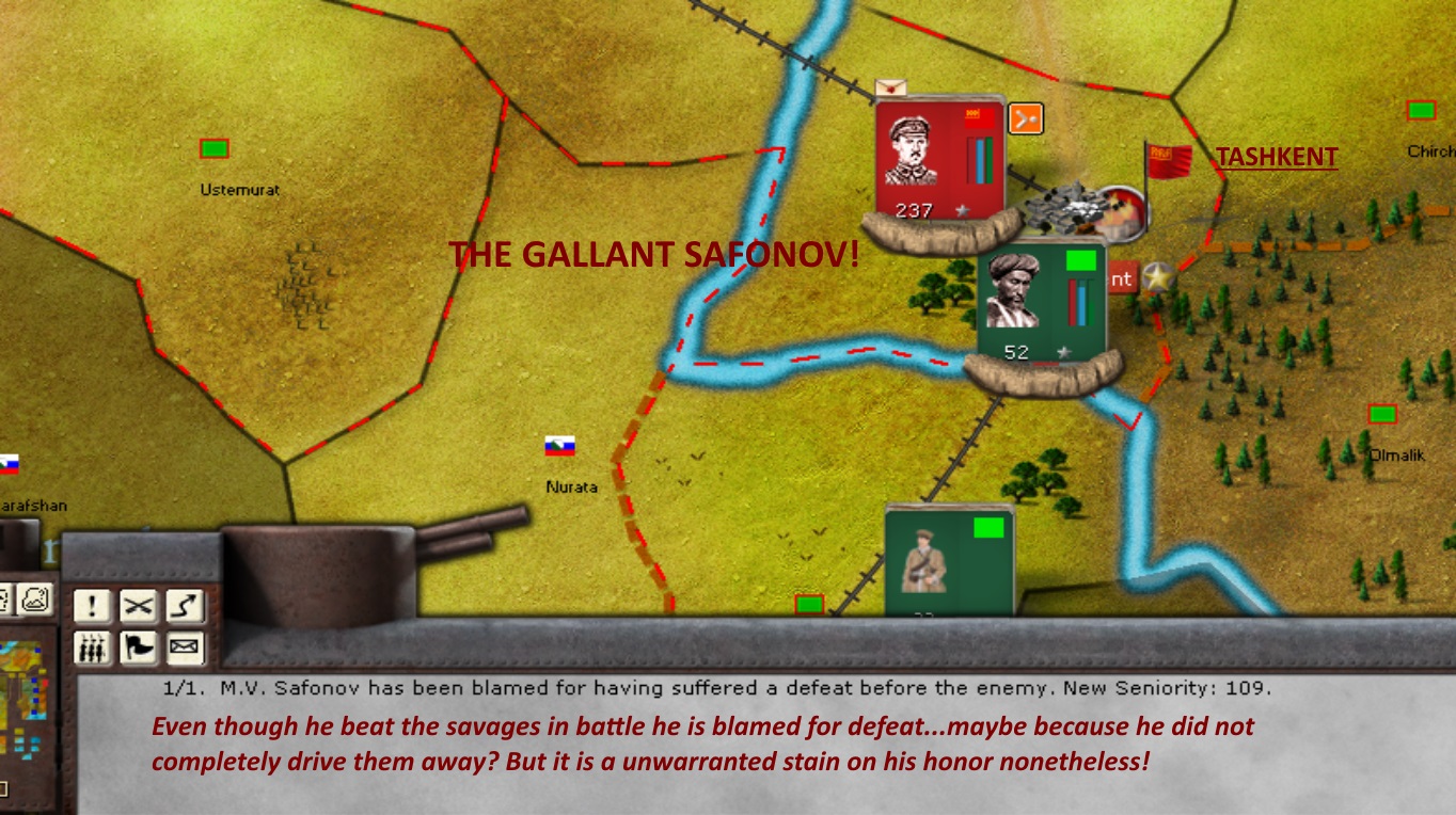 Safanov and his revolutionary patriots are defending Tashkent valiantly but they are surrounded by insurrectionist Green devils! And as I recall a White force appears from the south and captures the city, but who knows what will happen this time?