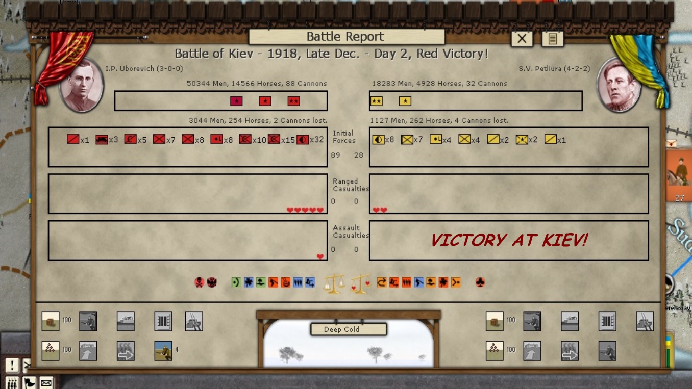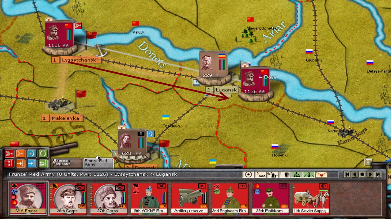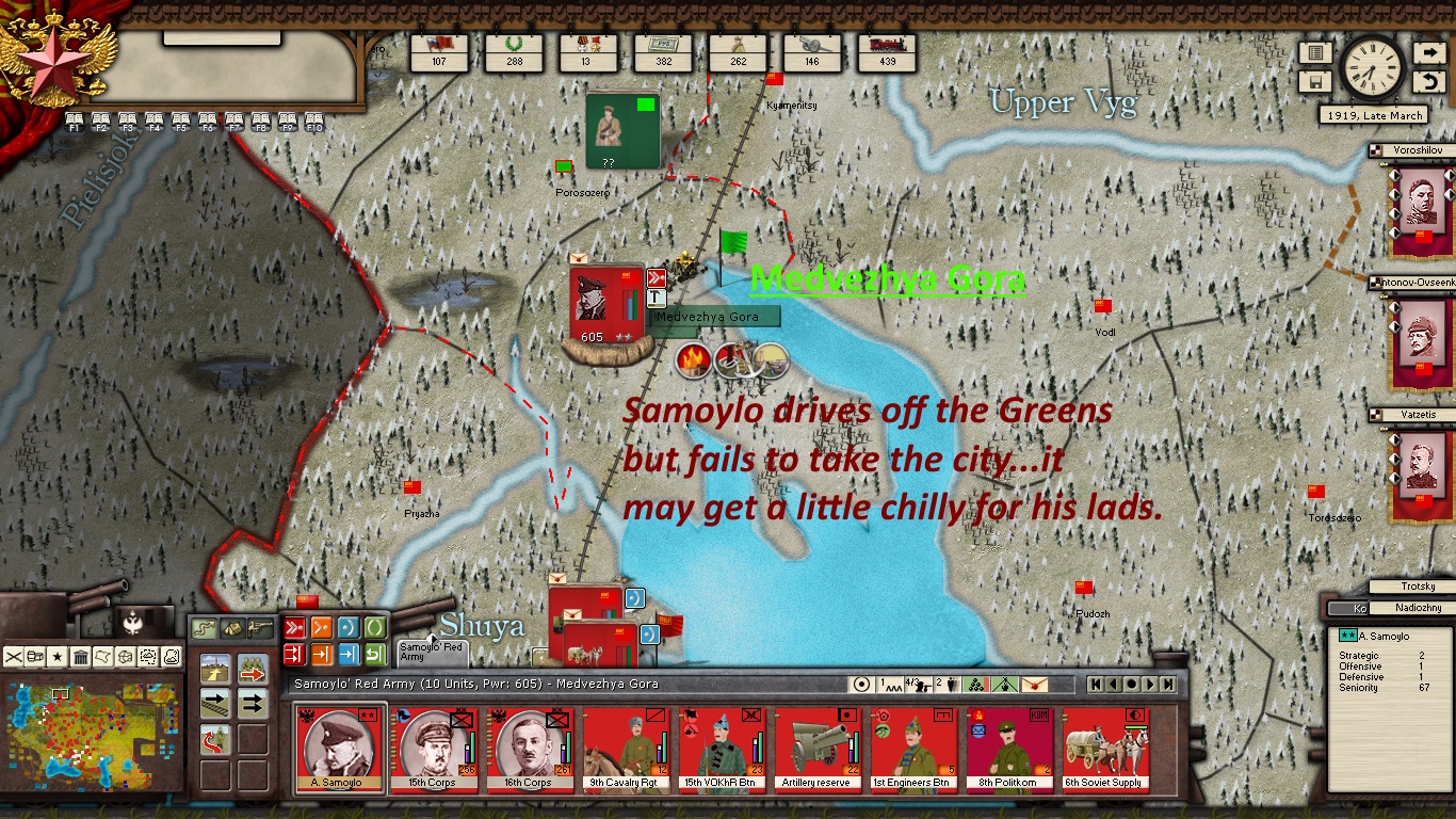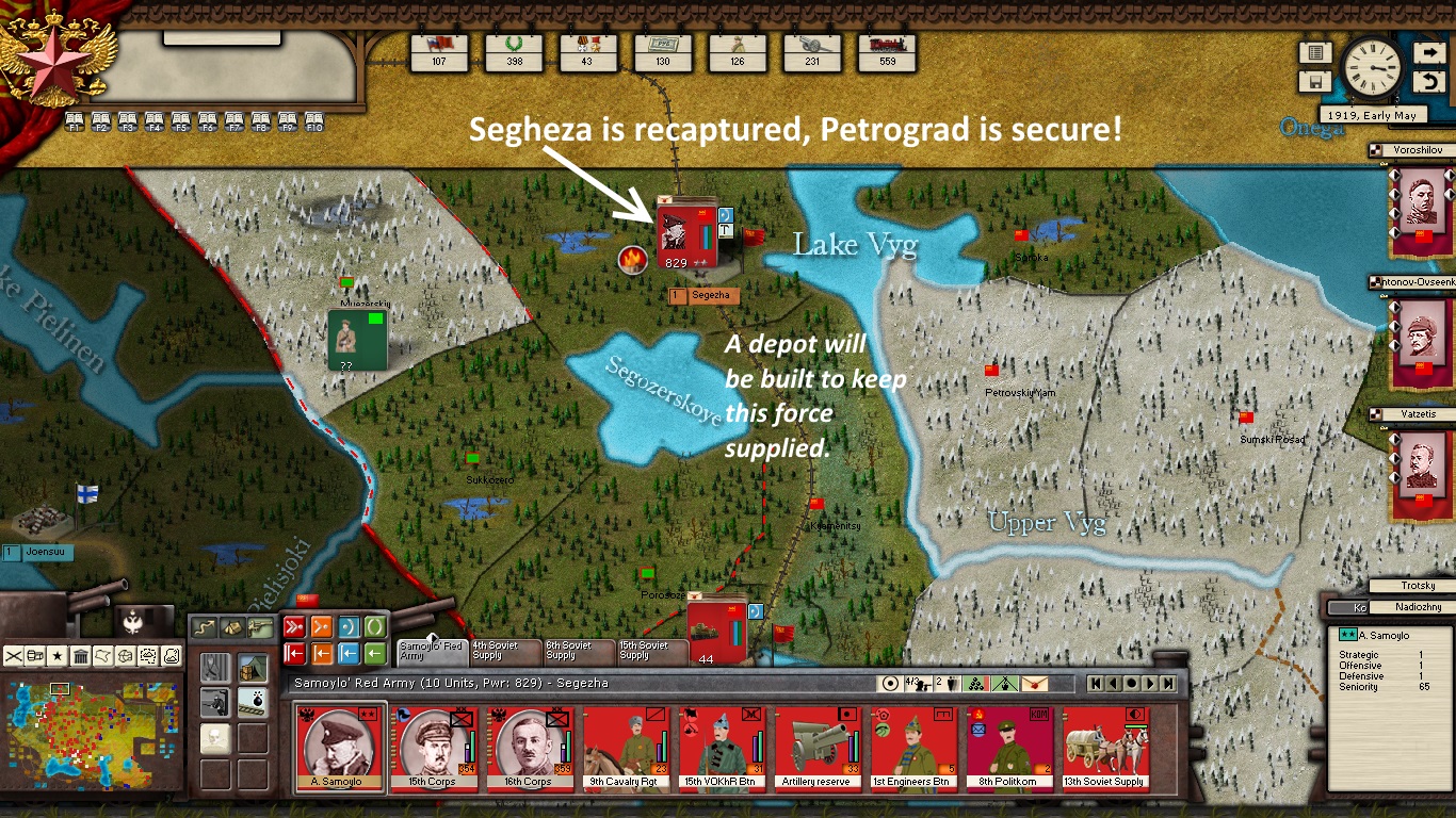 KOMCORs Tukachevsy, Snesarev and Samoylo are in the process of deploying their corps forward. Border divisions are forming at Polotsk and Smolensk. Reinforcements have almost arrived at Kiev and Ukrainian partisans are crossing the Dniepr River in force. The defenders of the revolution are on the march!