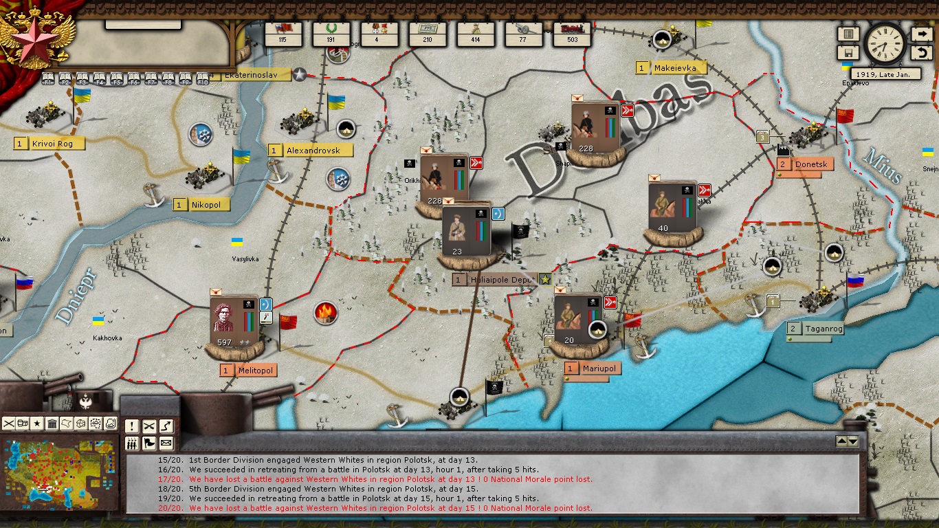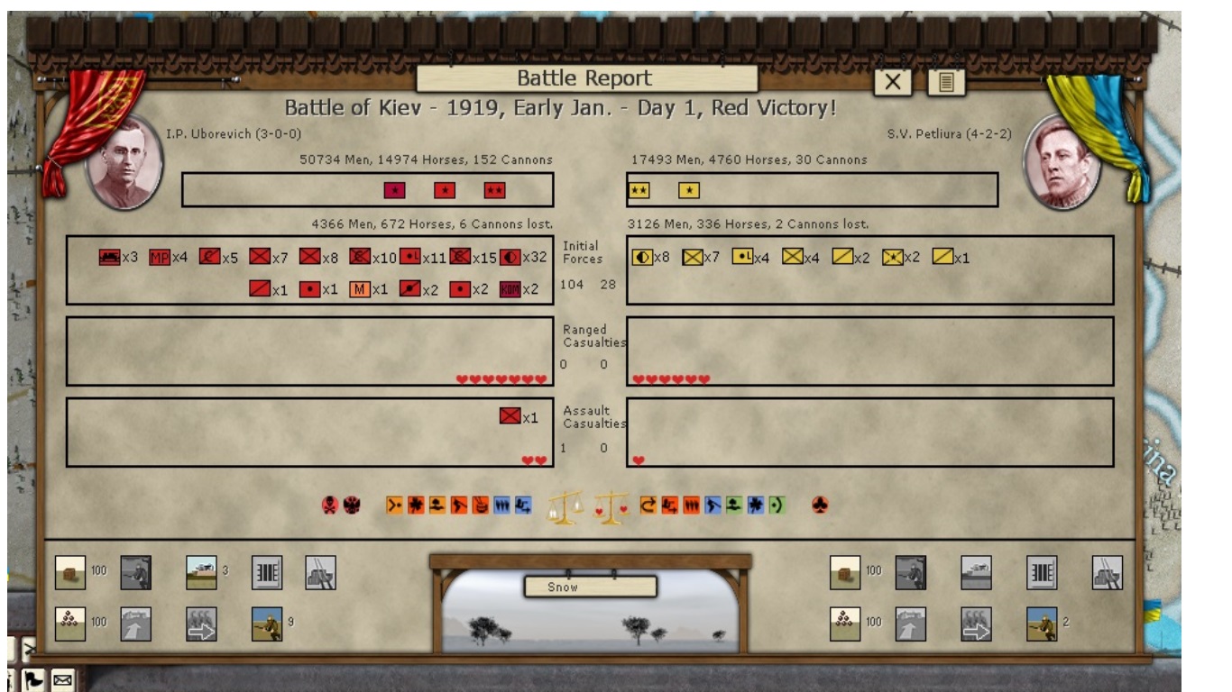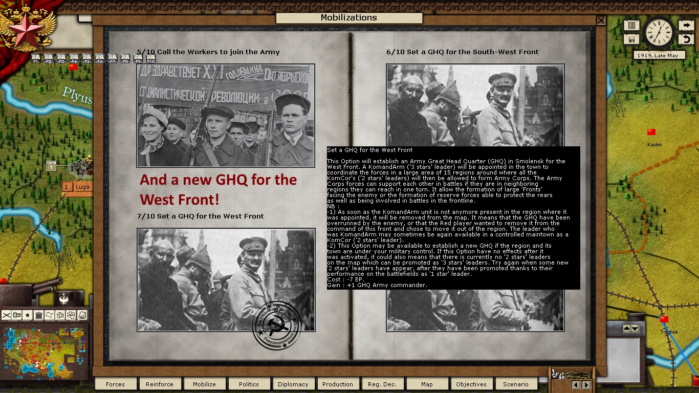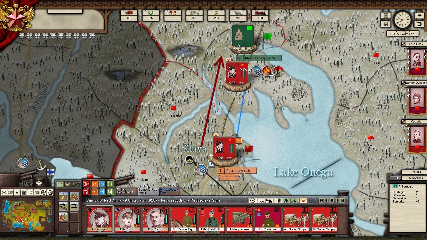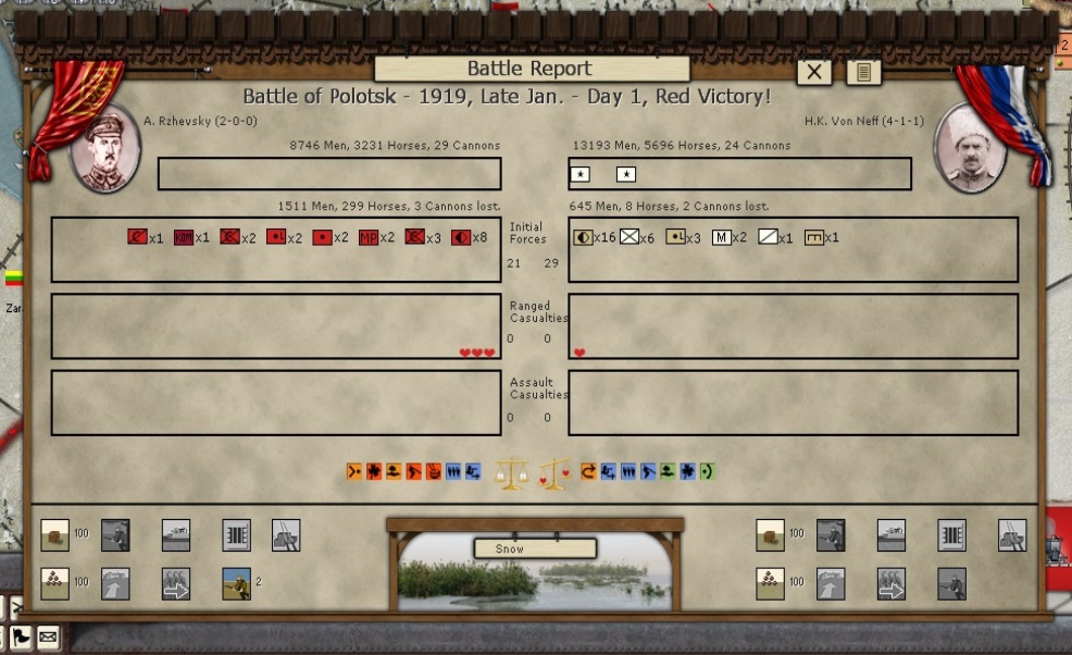 KOMCORs Tukachevsy, Snesarev and Samoylo are in the process of deploying their corps forward. Border divisions are forming at Polotsk and Smolensk. Reinforcements have almost arrived at Kiev and Ukrainian partisans are crossing the Dniepr River in force. The defenders of the revolution are on the march!