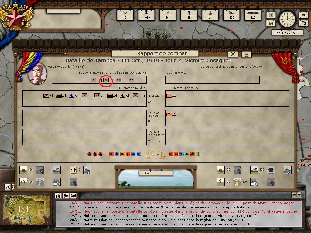 A Tsaristyn, 50 000 cosaques piègent Staline, commandant des armées rouges sur le Front Sud, dans la ville [facile avec l'IA au minimum]. Celle-ci tombent après quelques semaines de siège. La chute de Tsaristyn ouvrent la route vers le route et les Cosaques du Don remontent la voie ferrée vers Tambov. En septembre 1919, Trotski est signalé avec des renforts dans la région. Le futur rival de Staline est un général redoutable grâce à ses nombreuses caractéristiques uniques [train blindé personnel qui donne d'importants bonus aux troupes]. Cependant, les reconnaissances indiquent que ses troupes sont démoralisées. Kudinov, commandant l'un des corps cosaques, décident d'attaquer sans attendre les renforts. L'armée ennemie est repoussée et Tambov est assiégé. Plus à l'ouest, Denikine et Wrangel, qui remontent vers le nord parallèlement aux Cosaques du Don, mettent le siège devant Voronezh. Si les deux verrous sautent, les deux armées pourront faire leur jonction à Lipetsk et envisager une grande offensive vers le nord. J'aimerais prendre Liptesk avant l'hiver. Les quelques mois sans combats offerts par l'hiver russe me permettront de renforcer Denikine et les Cosaques, voire de faire remonter l'Armée du Caucase dans la région.