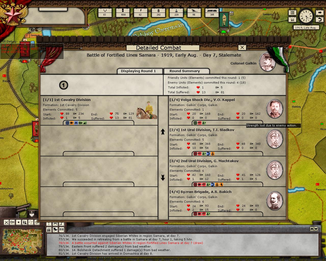 Late April, 1919: Red morale 79, Siberians 90, Southern White 84. Southern Front under Stalin captures Novocherkassk from a surprisingly small White garrison. His numerical advantage and numerous armored trains allow him to capture the city (although the battle outcome is ‘stalemate’ strangely enough, no doubt his lack of aggressiveness is an issue here). Frunze redeploys from the Caucasus to Cherkassy to become second-in-command of the Ukraine Front. Three divisions started in Tambov and Kursk to reinforce the Ukraine theater. Two cavalry divisions and some artillery and tachankas in the Moscow region, hopefully to build a mass of cavalry to fight in the Don and/or Kuban. Awaiting completion of the fort in Samara so that Eastern Front can move southeast to hook up with Turkestan front. Blucher moves out from Kazan, heading for Perm, a division+ force is coming from Kotlas towards Perm from the other direction. Turkestan front is pretty much cleared up, Kirov moving up the rail line from Aralsk towards Orenburg. Three requisition and one subversion mission complete this turn.