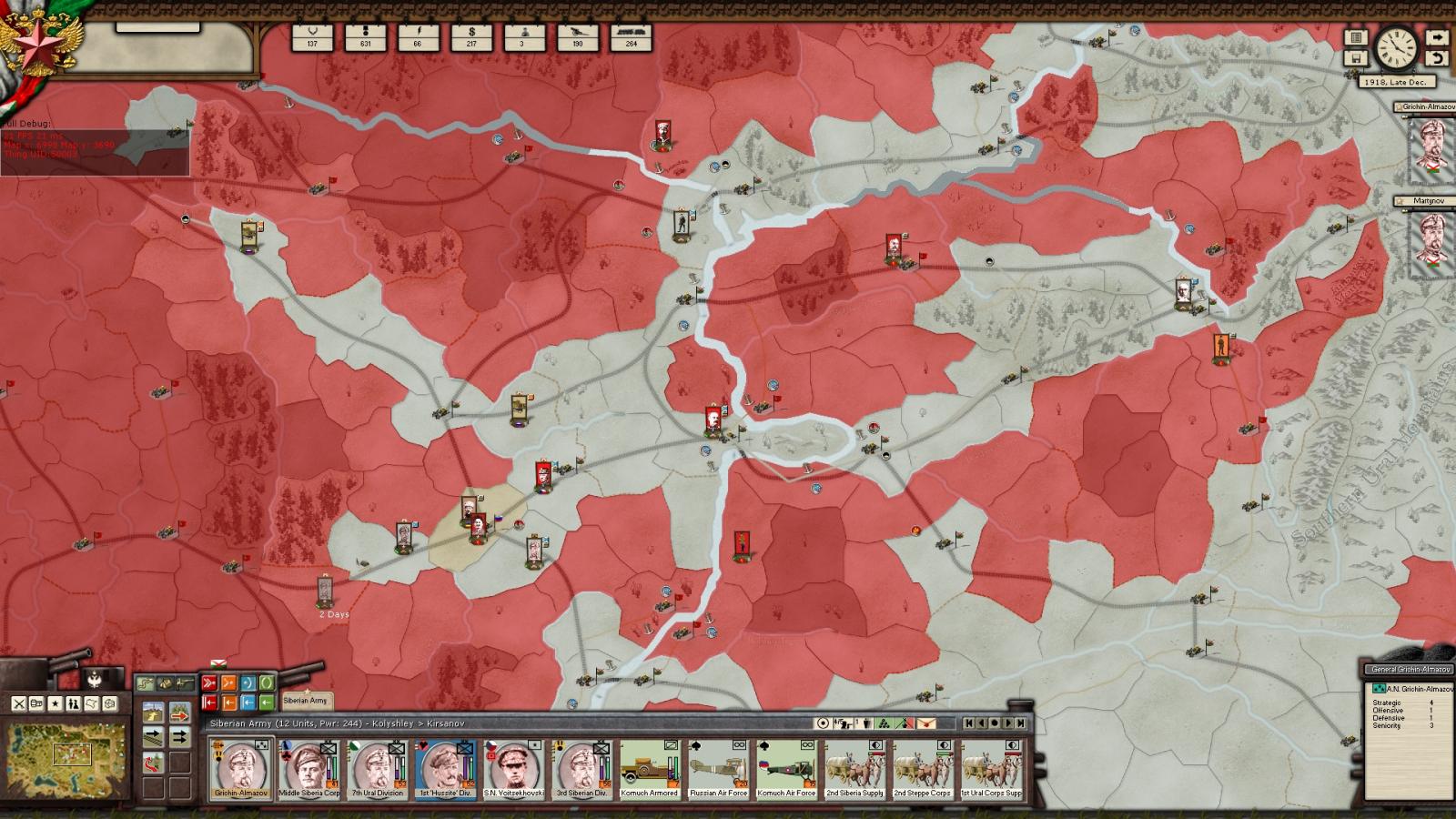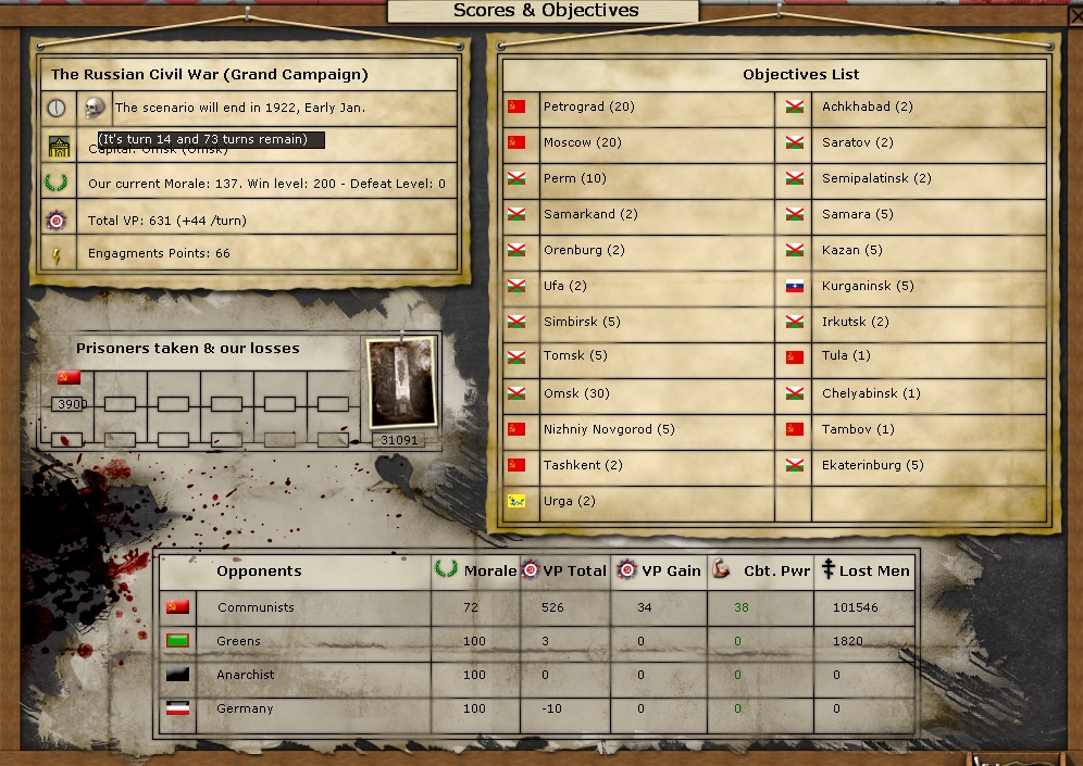 Turn 14: (late december 1919) in Previous turns Russian main army defeated in Kazan and retreated to neighbour region. Sib white(25000 men) had a battle with 40000 red men in kazan. and defeated red forces. In the battle late rounds half of the red forces flee from the battle.