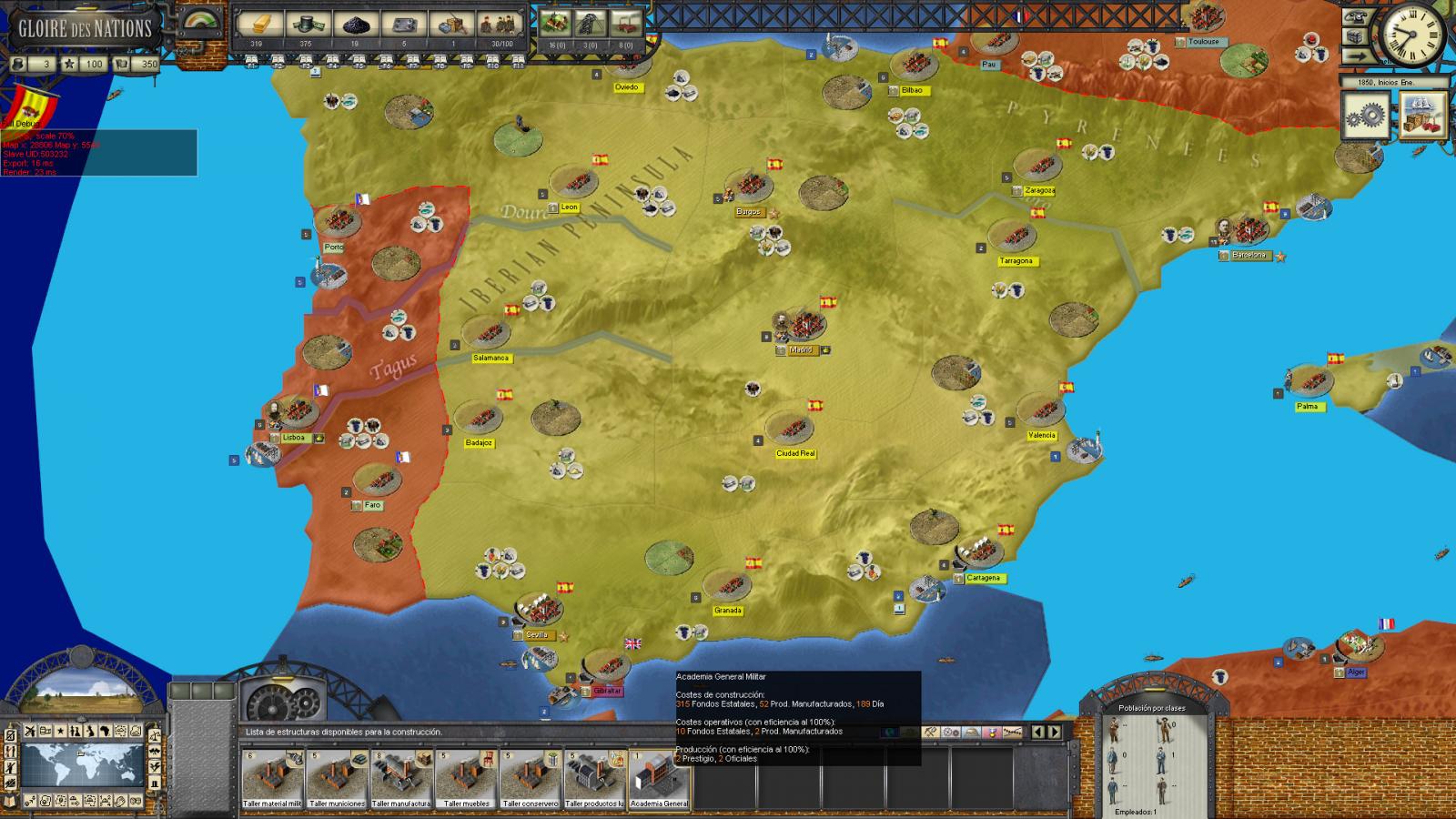 Se puede hacer también con España. La verdad es que se pueden hacer muchas cosas, pero lo básico, que era hacerla jugable, es lo que he hecho. Ahora habría que ver qué objetivos le ponemos. Yo creo que Nueva Yor, Paris y Londres estarían bien :) No, un objetivo podría ser alguna zona de África o de Asia, que podamos colonizar o conquistar por Esfera de Influencia positiva.
