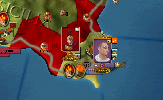 In the Caesar vs. Pompey scenario, one of Pompey's armies is inside of Syracusae and is being besieged by a smaller opposing force. In the current turn, the leader was active and tried to sortie outside of the city into the surrounding countryside and attack the besieging force. The army inside was put into attack posture and the sortie button was engaged. When the turn was executed, nothing happened. The force did not move. I've tried several different ways of getting the army to move out of the city without success. The only time I can get the army to move is to have it move to an adjacent province. I did notice the following odd collection of icons next to the picture of the army. Notice the icons for entering a structure and leaving a structure appearing simultaneously next to the picture of the leader. Is this indicating a bug that prevents the army from leaving the city into the countryside of the same province?