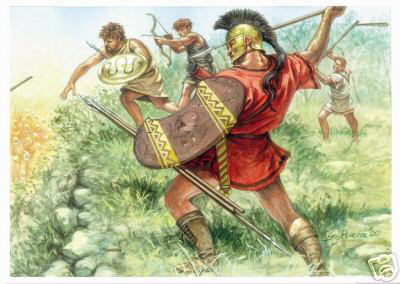 thereby not fighting as lancers, but spear throwing, mostly depicted with swords behind the shield, what however, giving historical pictures, doesnt make much sense for some time periods, while it makes sense if you run out of the few ammo :wacko: