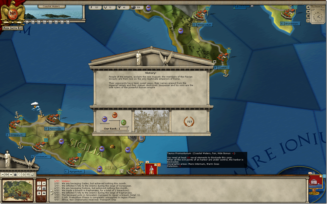 I am playing a Pbem game of the Year of the 4 Emperors scenario, I am playing the Vitellius faction, it is turn 14 and I have just captured Rome by siege then storming when I breached the walls...