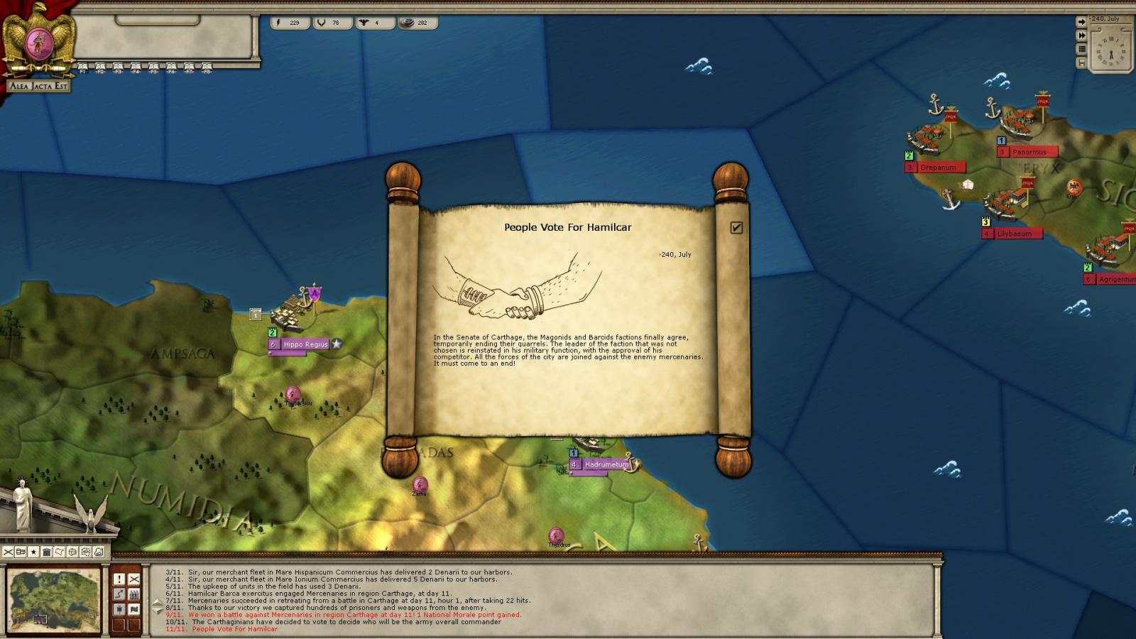 I'm playing the Mercenary War as Carthage and chose the event that costs 15 EP in order to get rid of the disputes between the Hanno the Great and Hamilcar factions. The description says there's 50 - 50 chance of either faction winning. I got lucky and Hamilcar won. However, if I understand the result screen correctly, the loser is supposed to be reinstated in his military role as general. But in my game Hanno the Great just disappeared and I only have Hamilcar. Not that I miss Hanno (he's an awful commander), but I'm just wondering if there's a bug in the event.