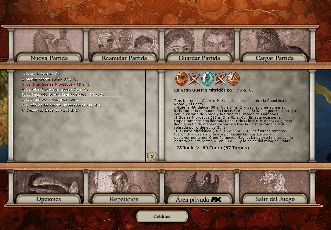 Bueno, tras fracasar con Mario he decidido probar con otro escenario, el de La Gran Guerra Mitridática, en este caso decidí jugar con Roma y enfrentarme a los Sertorianos y a nuestro íntimo enemigo Ponto