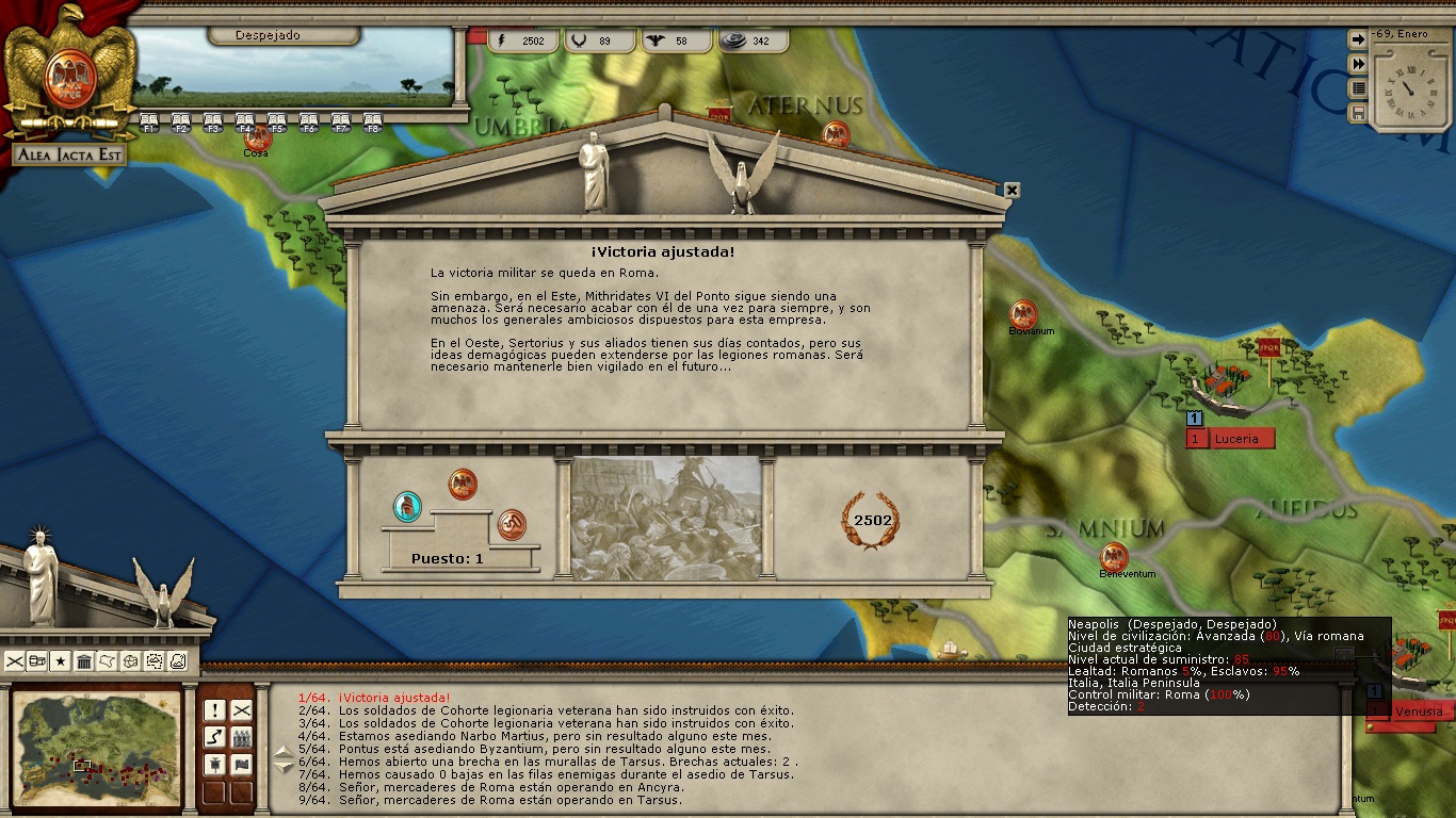 Bueno, aunque fracasé estrepitosamente en Hispania, los puntos contra el Ponto me permitieron ganar la partida, pero me quedó el sinsabor de saber que había sido derrotado con MAYUSCULAS en el campo de batalla por uno de los bandos en liza.