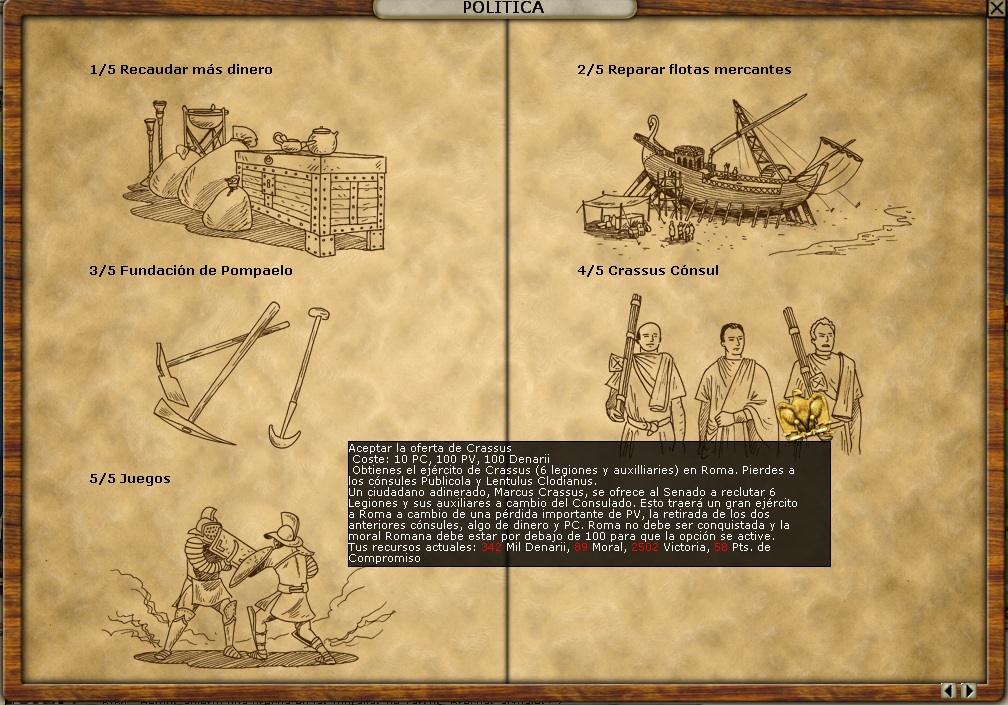 Otra cosa que no conseguí lanzar fué la decisión de aceptar las legiones de Craso, pq por más que cumplía los requisitos y la marcaba, al pasar turno, no había las 6 legiones por ningún lado