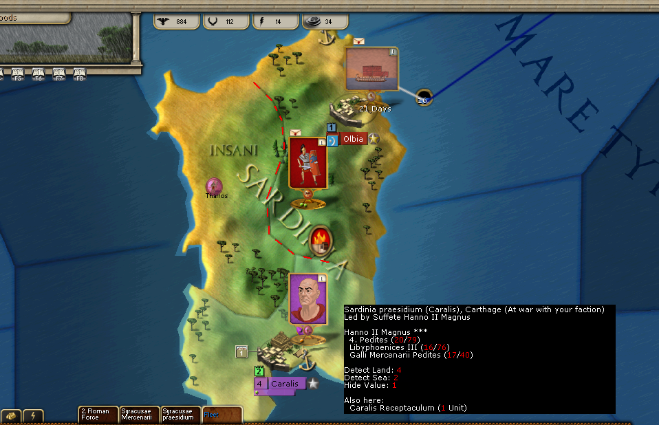 Hiero has managed to get himself drunk as a skunk and is now incapable of carrying out any orders (Locked). Titus will assault Olbia and my two fleets will merge in the sea adjacent to Ostia. The Last time Carthage sent their fleet to intercept it arrived via the West coast of Italy. We will see.