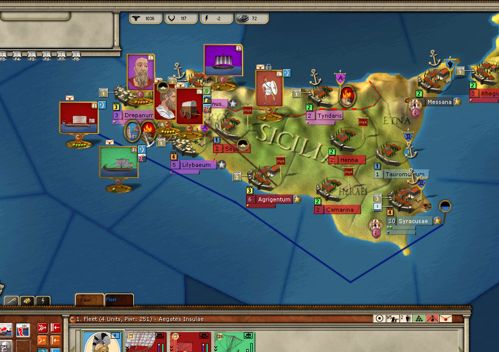 Hanno and his army have evacuated to N Africa. Dunkirk style. My blockade and siege of Lilybaeum were unsuccessful. I sent my fleet to Syracusae to refit and rearm.