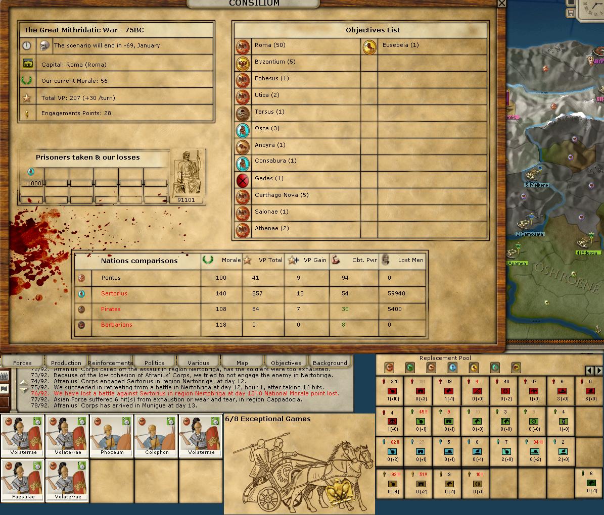 By this time National Morale was over 140 and could be considered a credit to be drawn upon to restore the Legates and their contingents to full force and support the other offensives. The great misfortune was a lack of things to expend it upon.