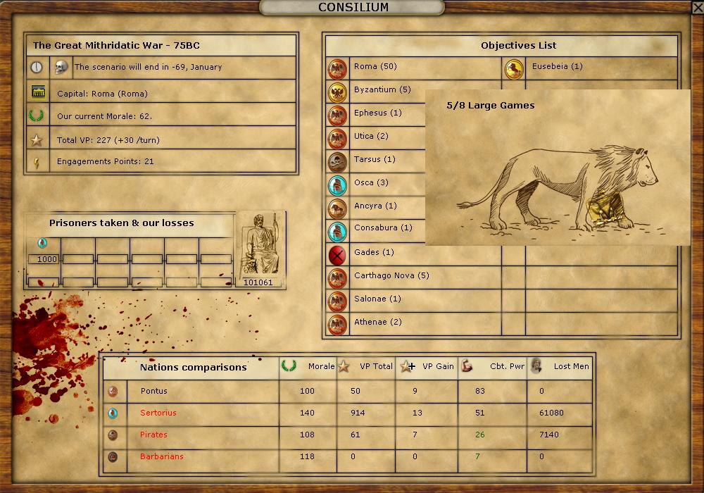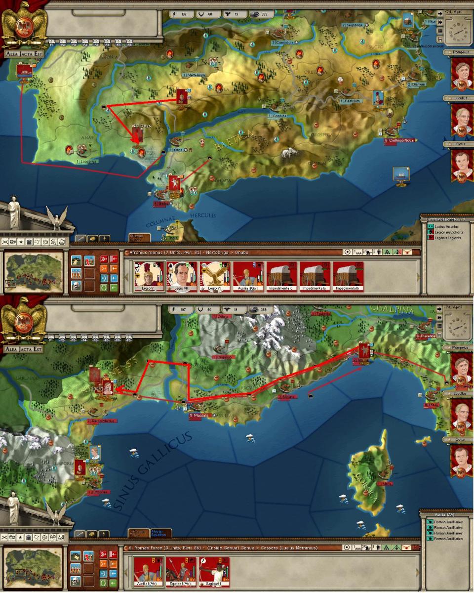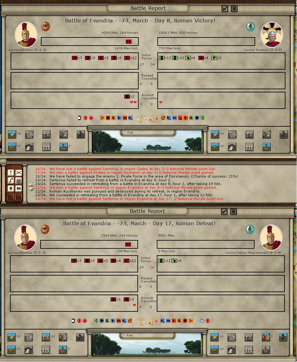 Battles. There were 2, and I escaped with my elements mostly intact. I lost Italica to assault (including my auxiliary unit). Then Afranus (who is trying to survive was caught, and cornered). It only cost me 1 element this time.