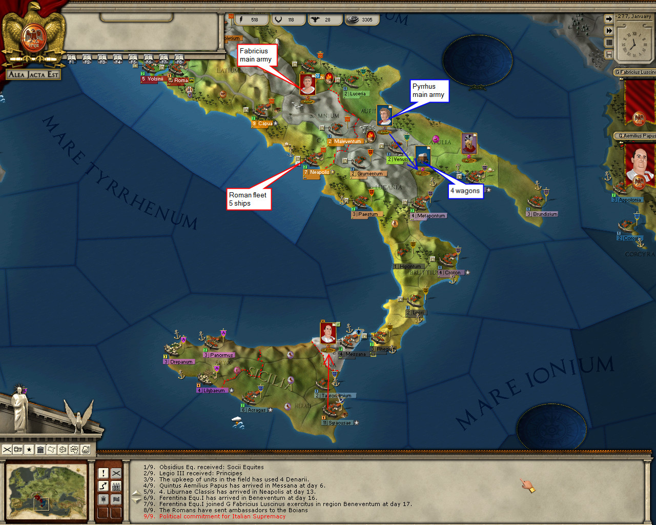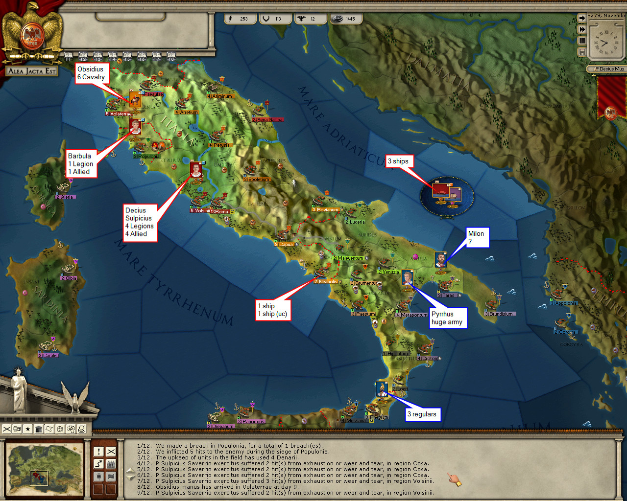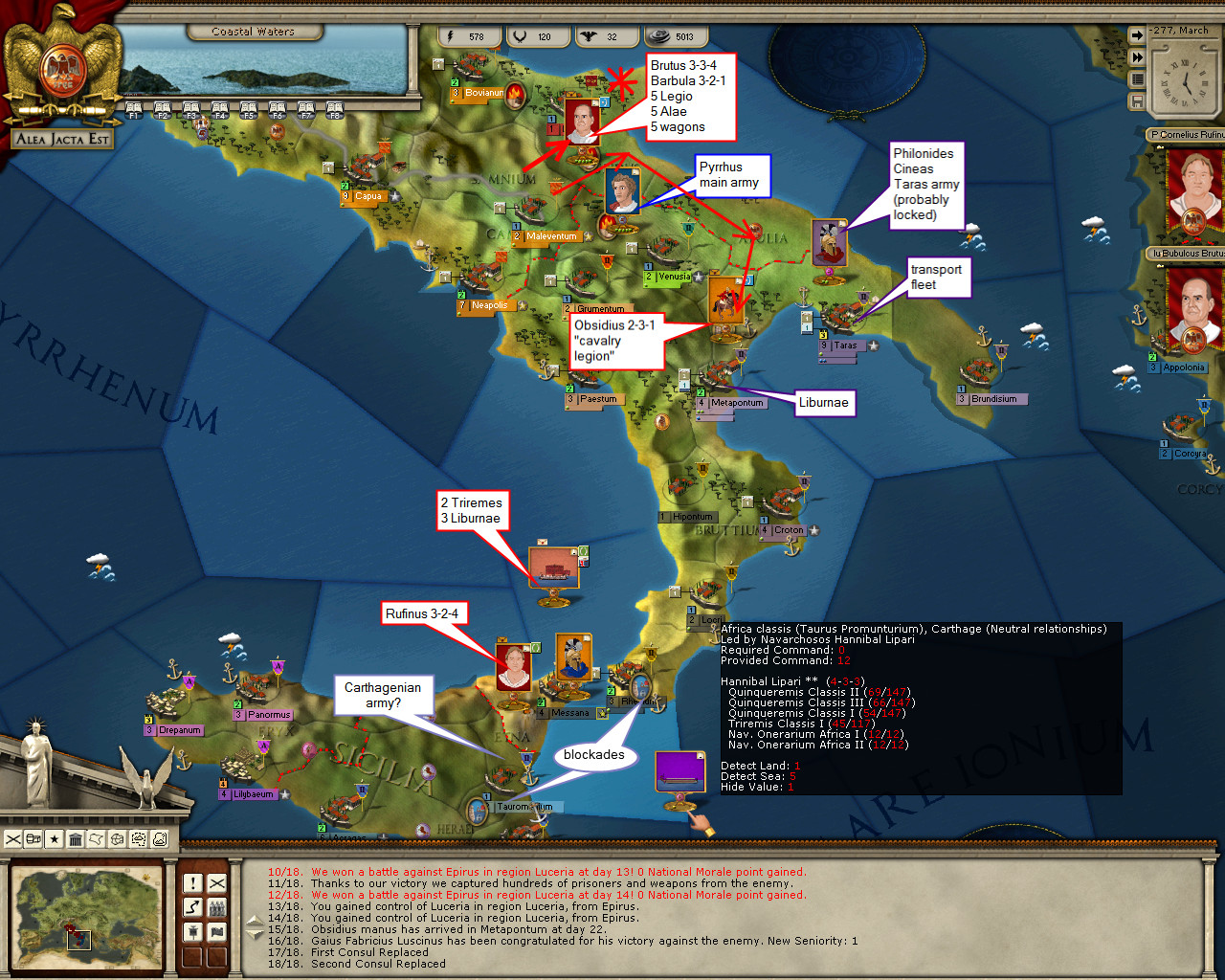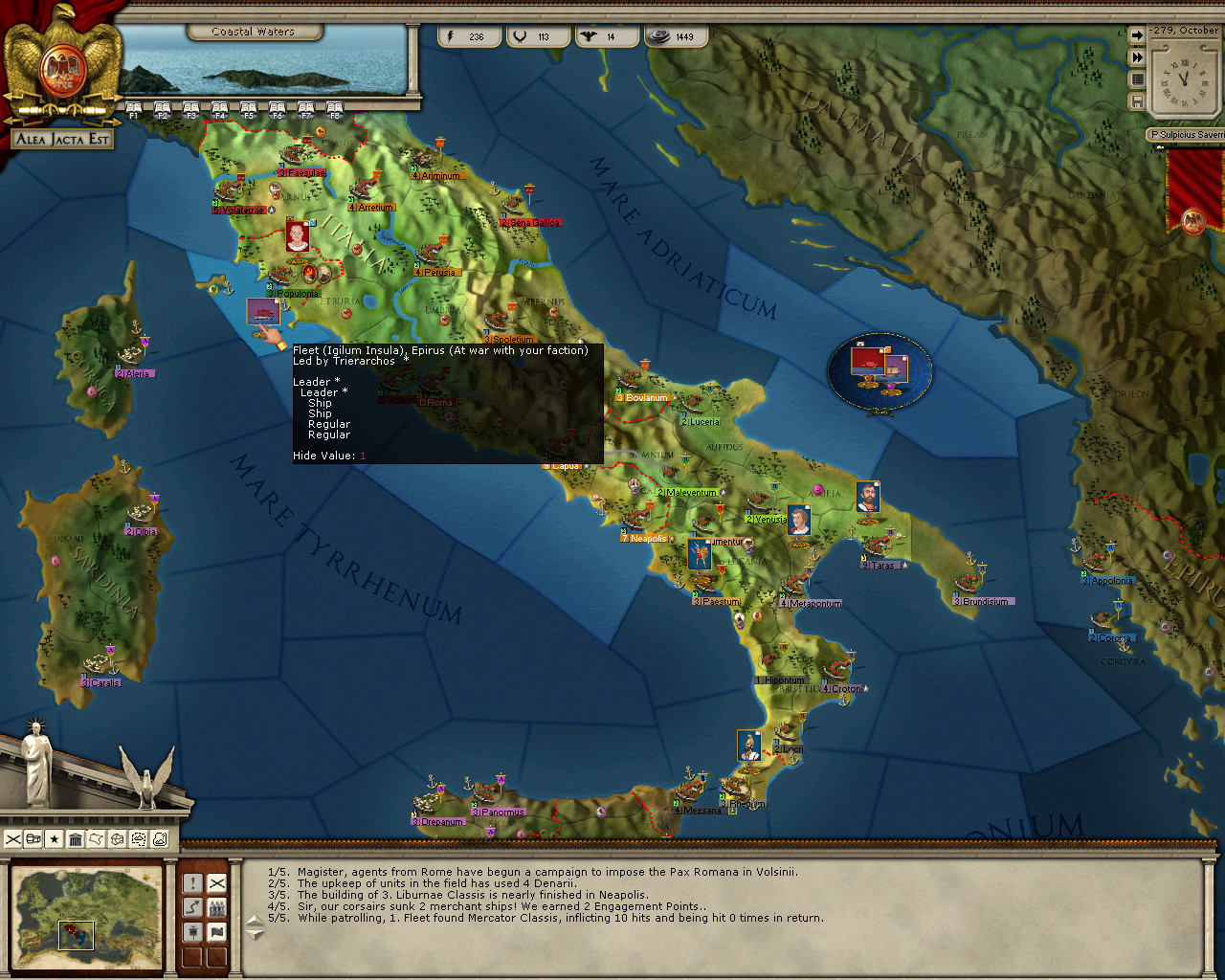 I wish I knew what was going on there. It’s seems Messana is under siege, probably by Pyrrhus allies in Syracuse (based on the province control info). And obviously, Epiran ships are blockading the city. Hmmm …