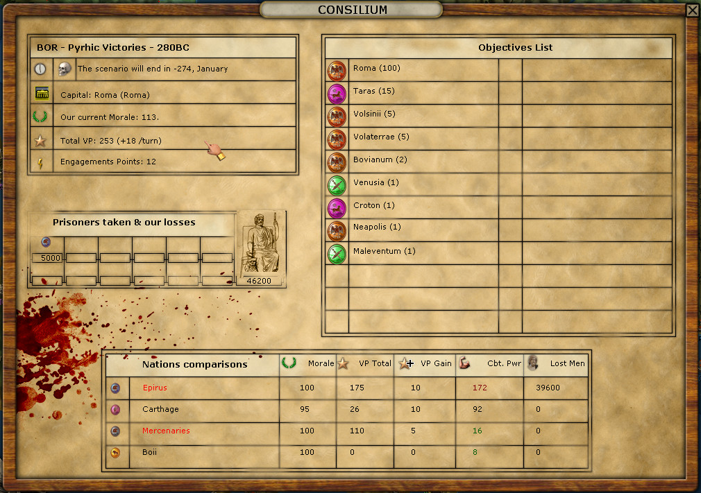 This is actually a tricky decision. I’m still way ahead in VP, but narrowing that gap by 20 is a lot (that’s the other cost of the option). Plus, I suspect what keeps Pyrrhus south of Rome is a strategy of Dictator denial. Do I want to remove that incentive of him not attacking me up north?