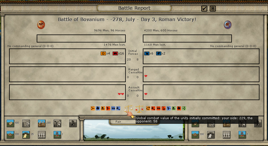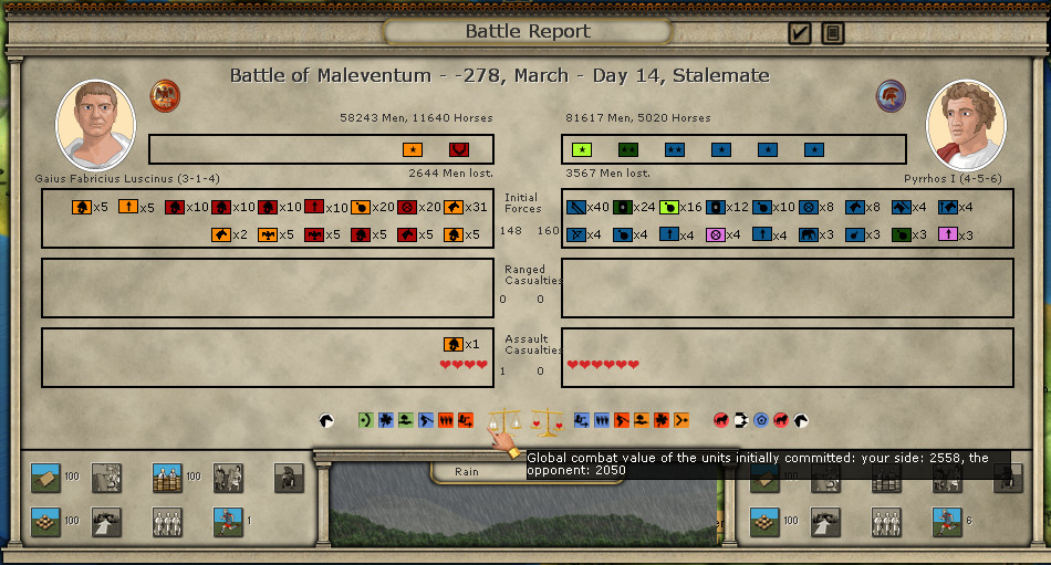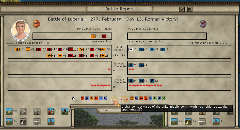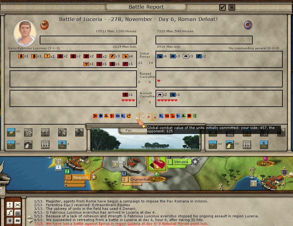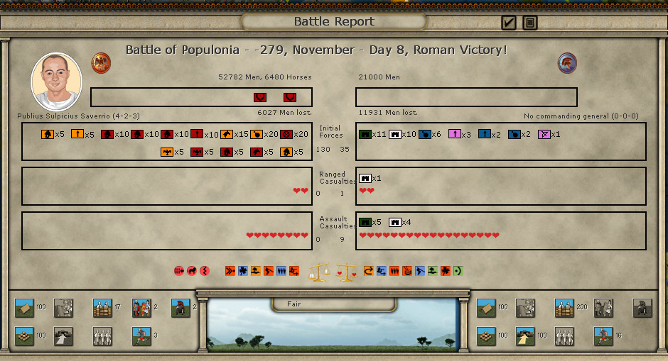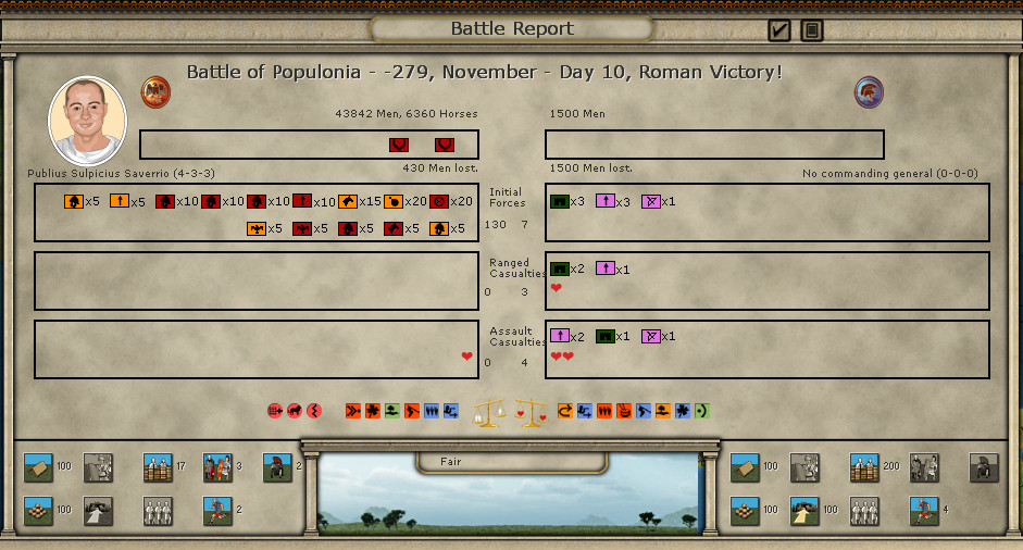 Sulpicius is not a bad general now - two XP stars from the battles has made him a 4-3-3 leader. Too bad he’ll be out in the next consular elections, by the time I face off against Pyrrhus in the south again.