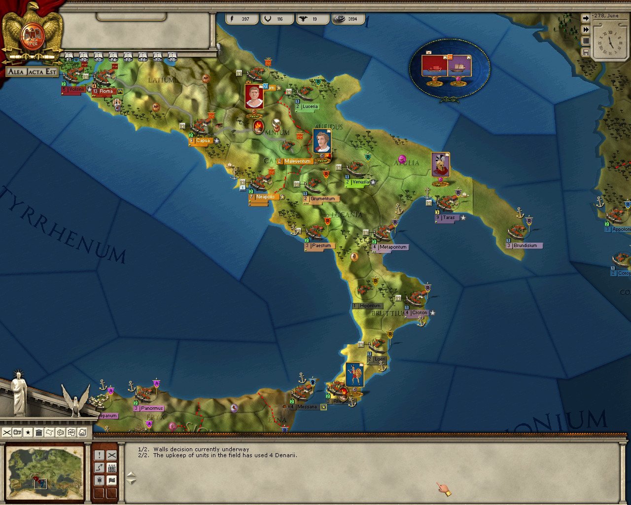 Aemillius moves to Messana, expecting that Milon may go there with his army, but he doesn’t. Not much to see here actually, so, I’ll probably send him back to the main army at Beneventum, where he can be useful in his remaining months as a legion commander. His career as a spy has been less than spectacular. Fabricius got a promotion after his defeat at Lucania, so I know he won’t take command by accident.