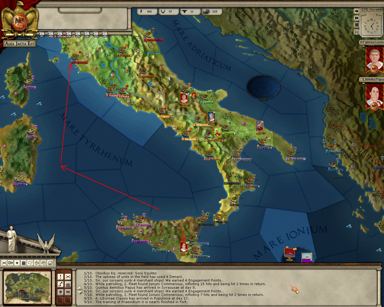 And what to do with my navy, who has brought me such welcome news? I think we shall come to the aid of our Carthaginian friends. Ahead full, ram speed ... if Pyrrhus tries to battle that Carthaginian fleet again off Catania, he'll get more than he bargained for!