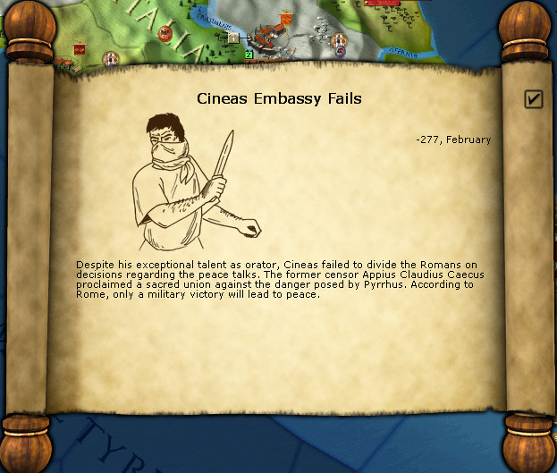 And the Cineas embassy failed. We Romans are a stubborn lot: