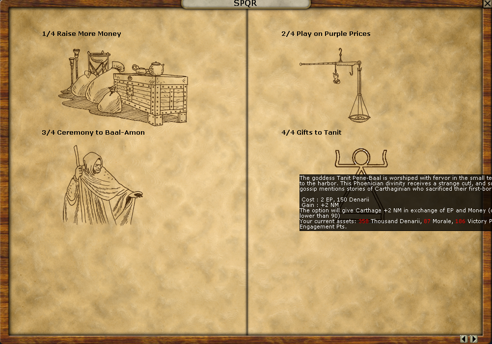 Since my NM is so low after the devastating losses in Syracuse and the previous series of battles in Messana, I now have a set of options to increase it. Last turn I played Gifts to Tanit, and my NM went from 85 to 87.