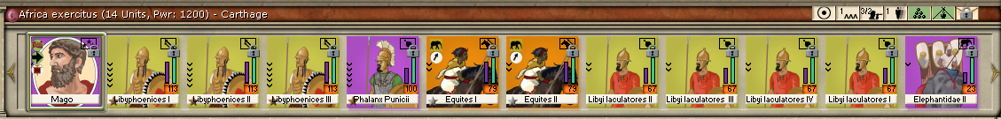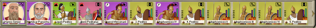 The Roman army in Tauromentorium moved to Henna and is now laying siege. I bought some replacements, but I don't really have money to replace most of the army at this point. So instead, I maximized the army's total power by substituting some of the most damaged units with the fresh troops shipped from Carthage last turn. This is Hanno's army composition at this point: