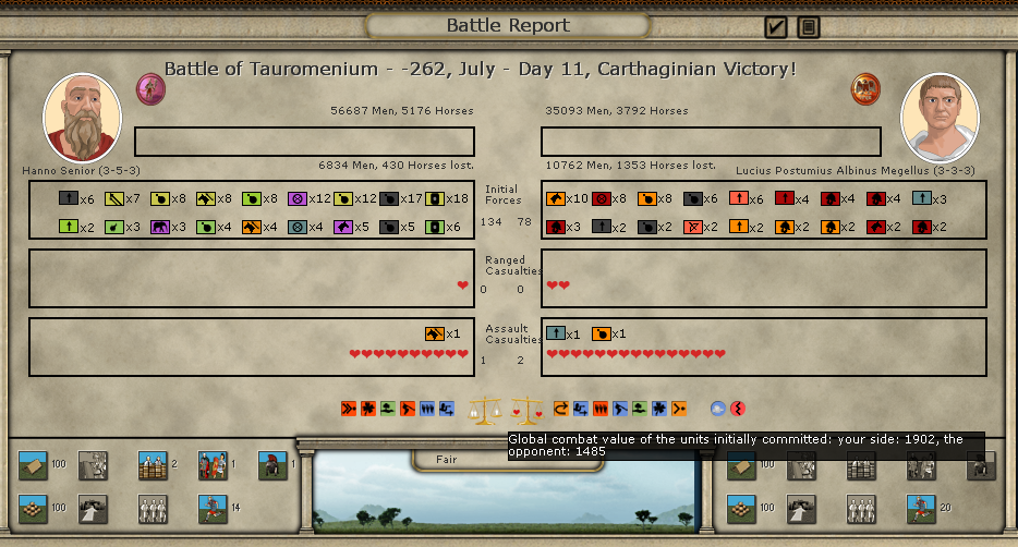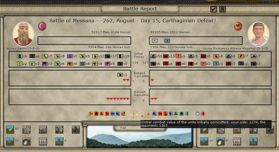 Here are the battle results. It seems the Roman commander has a trait that allows him to deploy extra troops, which in a limited frontage situation like in the mountains in Messana can be very helpful: