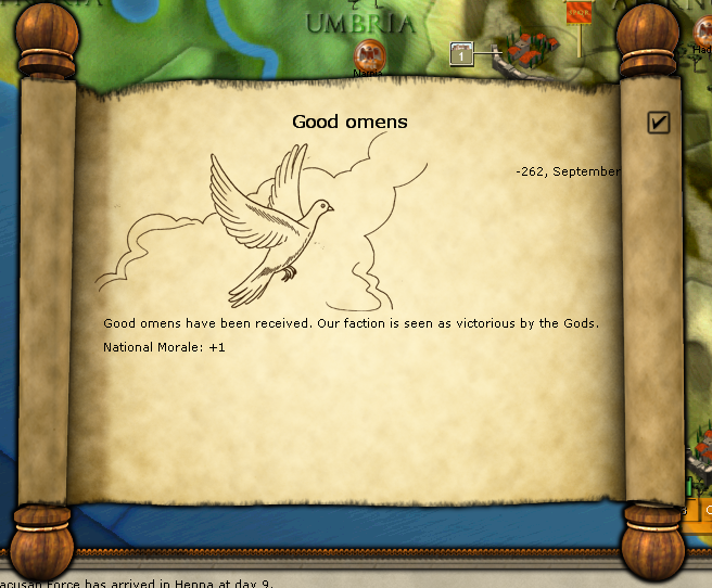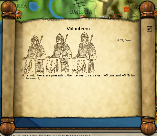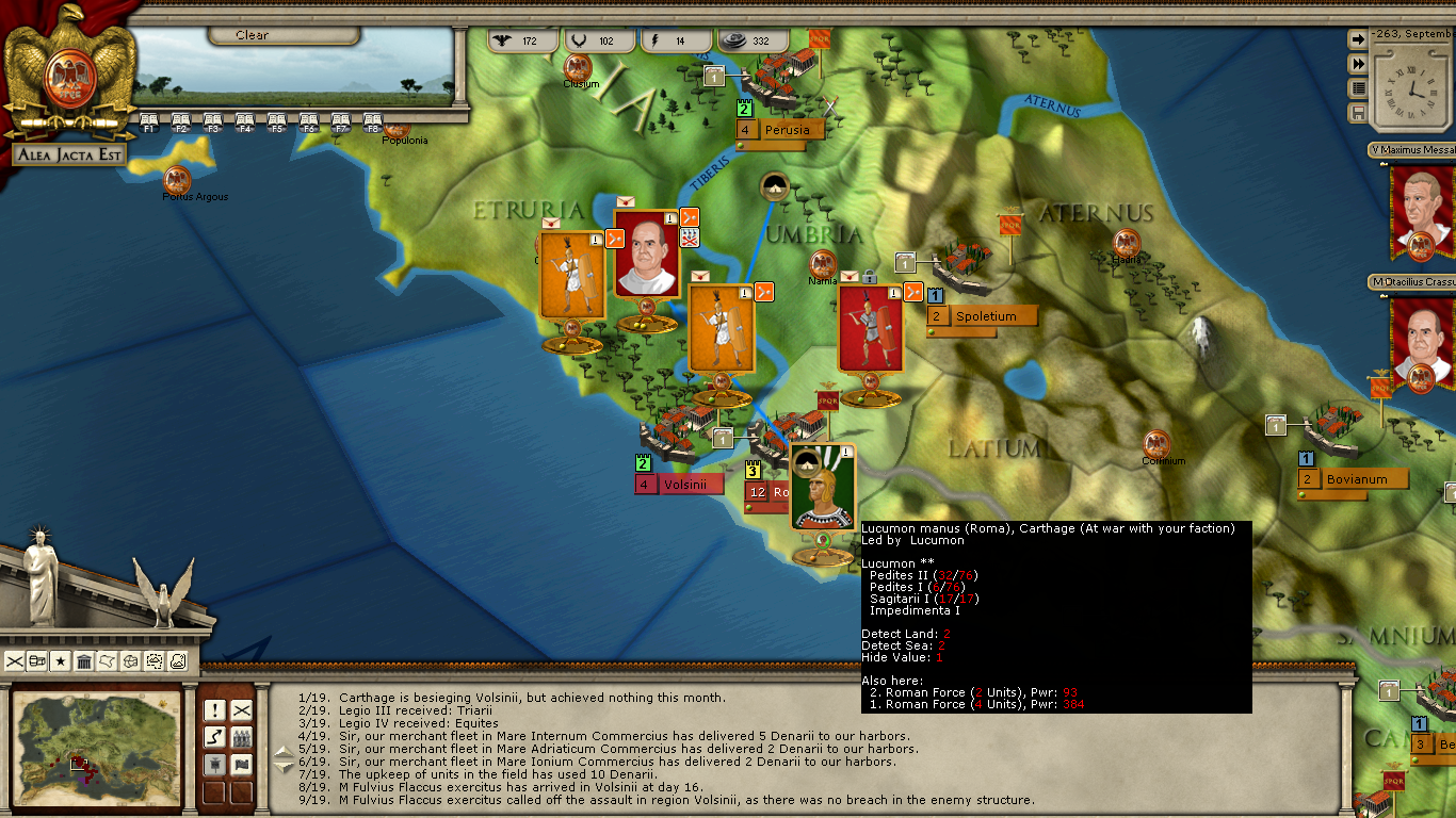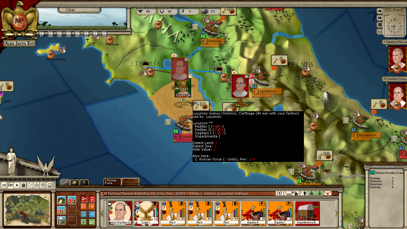 Lucomon retreated into Rome. (He has an awful habit of doing that). I have split up off two Alea units from Octa's force. One shall remain in Volsinii on Assault posture, the second will head North East to Umbria, the Urba Legion in Rome, along with a few garrison units, will sally from Rome and attack Lucomon. Octa will target Lucomon. If Lucomon is engaged I hope he will retreat into one of these ambushing forces.