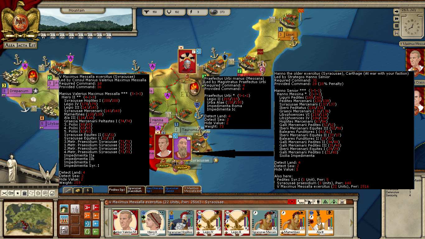 Hiero and his armies quick recovery has allowed me to send on the majority of it to merge with Lucius. This will give me a stack in Camarina of about 2500. All the units within it will nearly be at full strength. The vanguard will be made up of two legions and a unit of Syracusan Hoplites. They alone have a pwr value of are nearly 700.