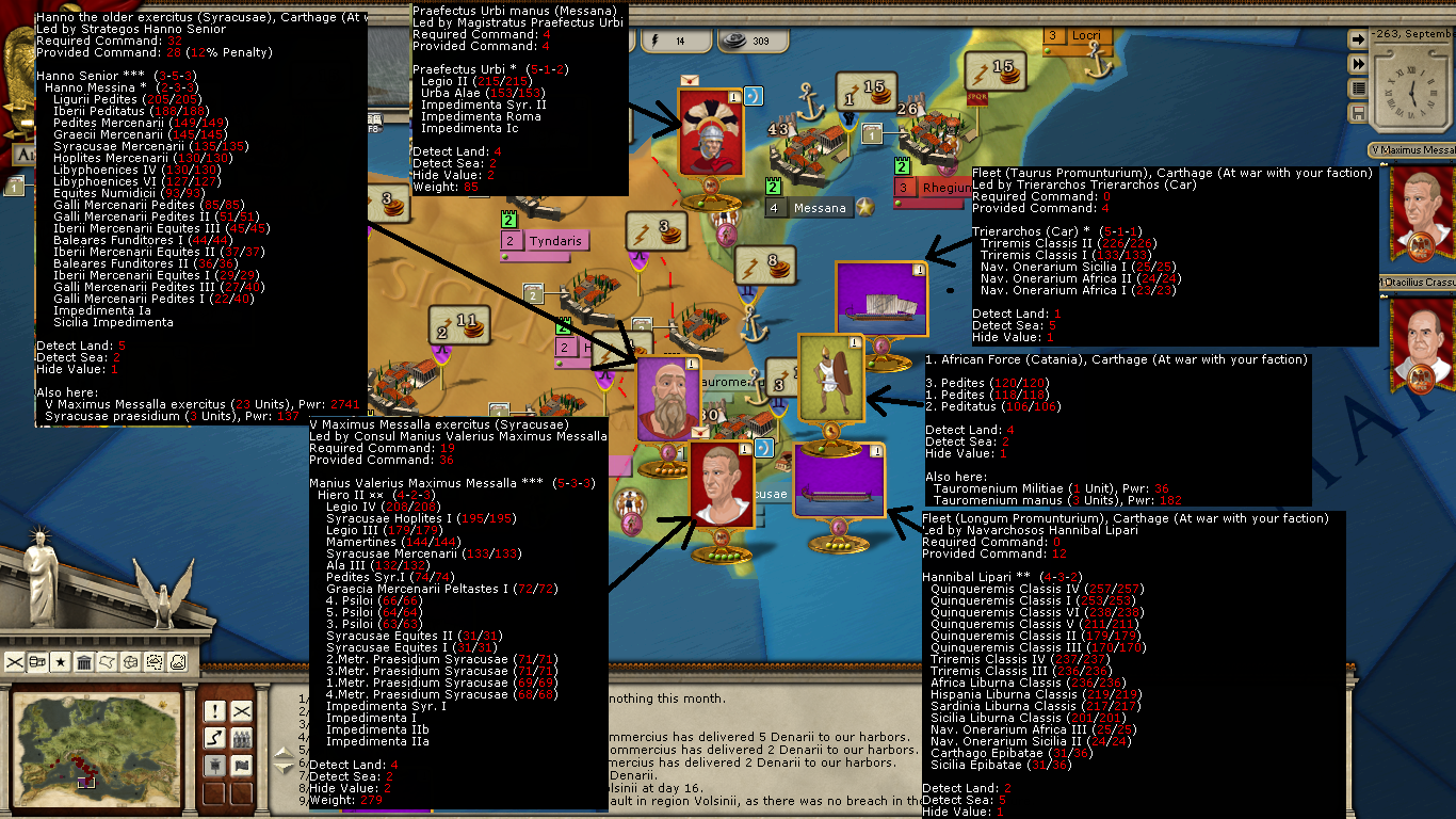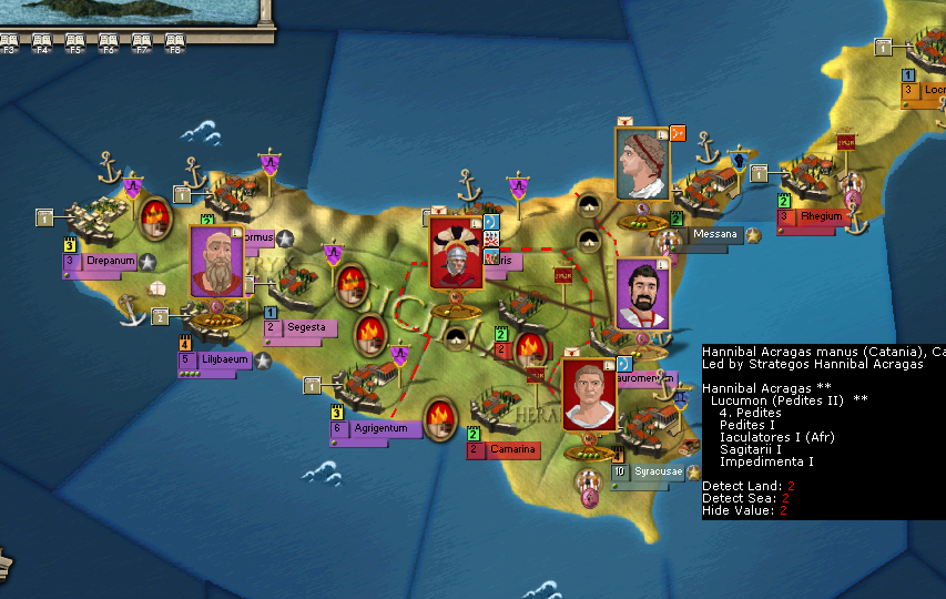Hiero will see out the siege of Henna. The forts pwr value is down to 18 so should fall next month. He will then head to Messana. If I can get that small force to cross the straits next turn he will merge with them. I plan on using him to hunt Hannibal out of Catania if he still lurks there.