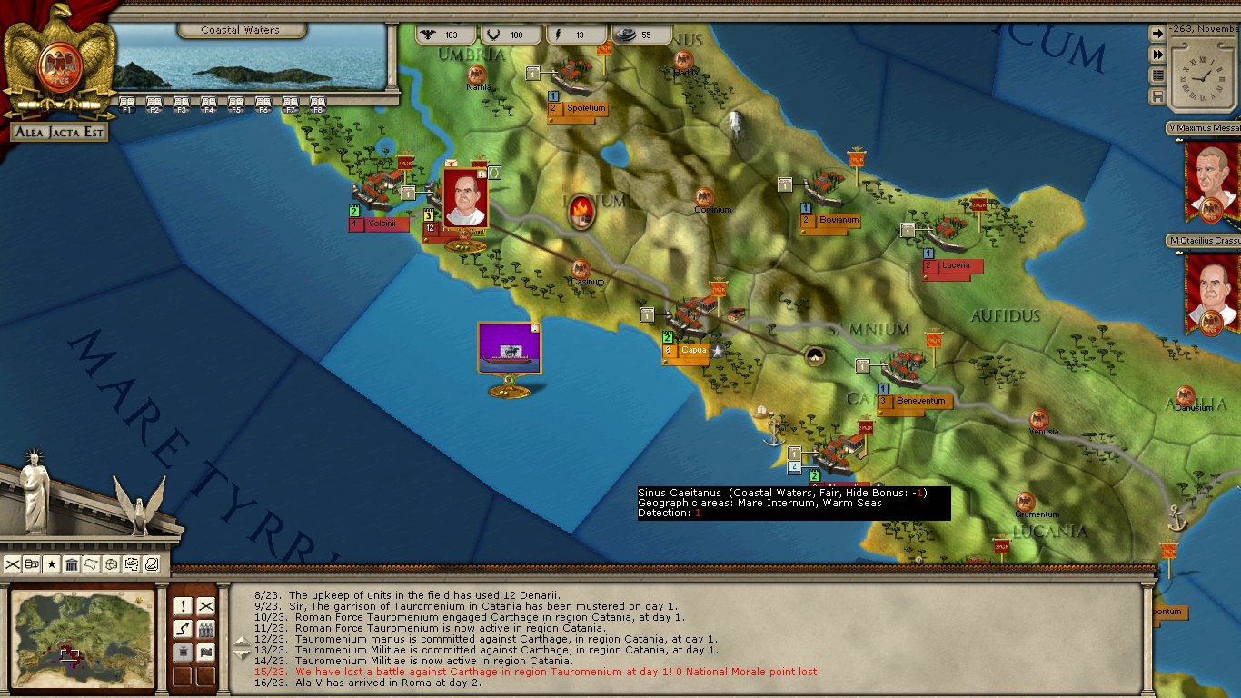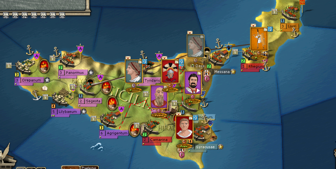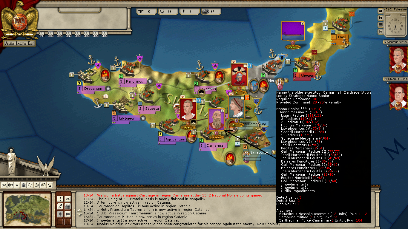 I have two Ala units and two Cav units in Neapolis which I am going to force march to Rhegium. It will take 25 days. From their i Hope i will be able to get them across to Messana. It is currently free of blockaders.