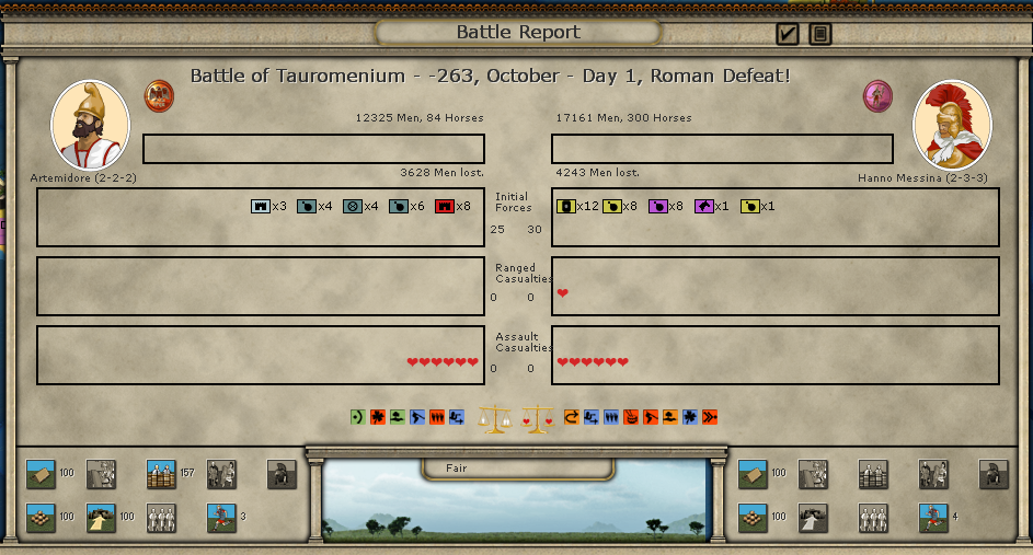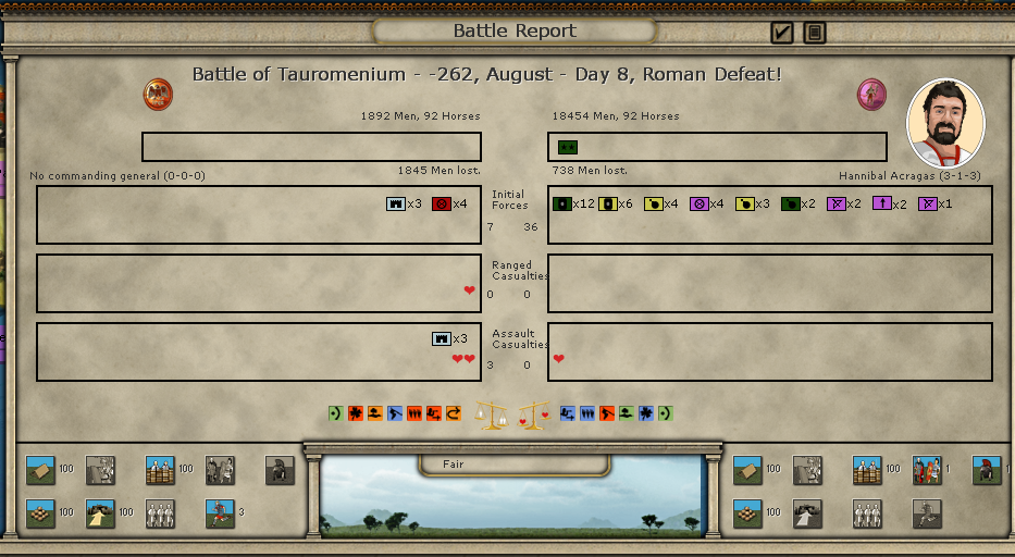 The army that had laid siege to Messana, led by Hannibal Acrigas Manus, marched into Tauromenium and assaulted the fort. Lucomon and his remaining force is by his side!! The garrison was destroyed but the Cart managed to hold on and keep the fort in Roman hands. (They must have dressed it up like a raging bull or something).