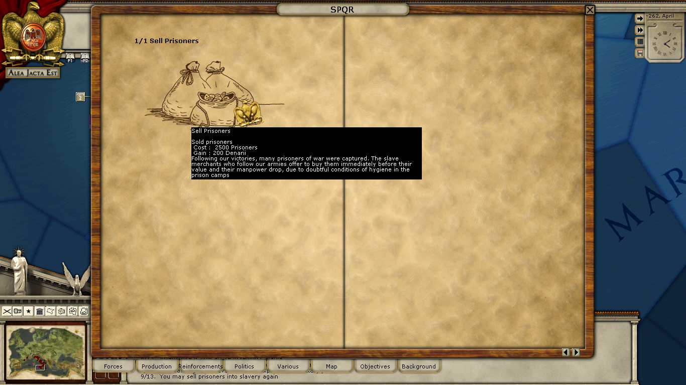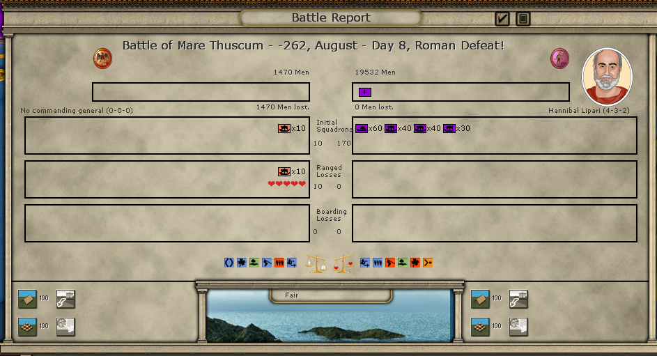 Henna finally surrendered. Gained 1 NM from the surrender. The Massalian fleet got hit by a storm on the way to Ostia. Didnt lose any elements but took a fair amount of hits :( Gained 1 EP from strategic decisions. I will need plenty more as the option to persuade Emporiae to join our cause costs 20 EP. I am able to sell more prisoners again. Another 200 D to spend nearly all on Replacements. Hanno retreated all the way back to Lilybaeum.