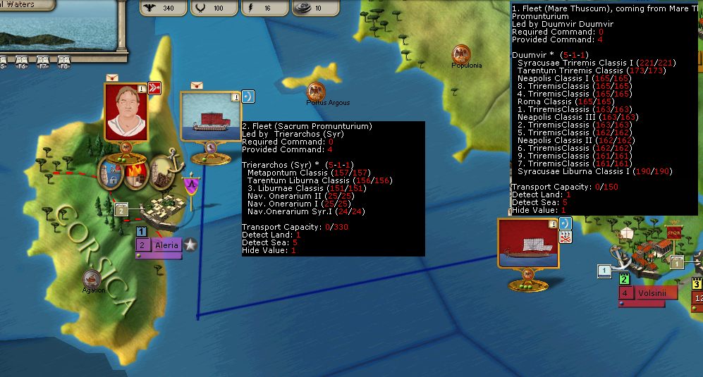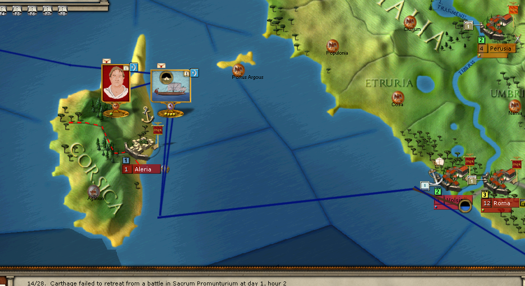 In the North my plan has kinda worked. The Carthage fleet arrived off Aleria after my two fleets had combined but there was no engagement. I suspect because the Carthage fleet had intercepted the single Trireme unit on its way to Ostia so that when it got to Aleria it had reverted to a defensive or passive stance.
