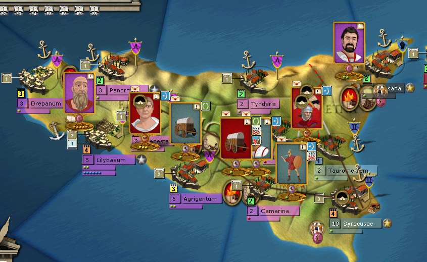 The Carthage Navy did not return so Urbi made a successful crossing. I am not going to move him anywhere until the situation is resolved in Syracusae. I may use him to Siege henna while Carthage is distracted by Max and Hiero. Or I may combine him with Max and Hiero and then split the force in two to give me two fairly effective fighting forces. We will see.
