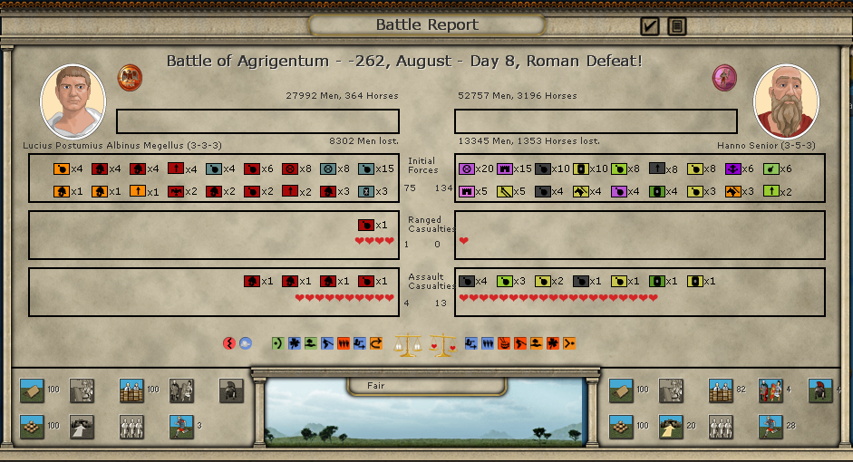 So in the end it looks like I did push my luck. And I suffered the consequence. I was a victim of my own success. I suffered pretty devastating losses across the space of two battles in Camarina. From viewing the replay it looked like Stratego was in the process of attacking into Syracuse. Their field of battle was in Camarina.(In hindsight it would have been much more beneficial for me to hold tough in Syracusae and let the Carthage attack activate Hiero's army.)