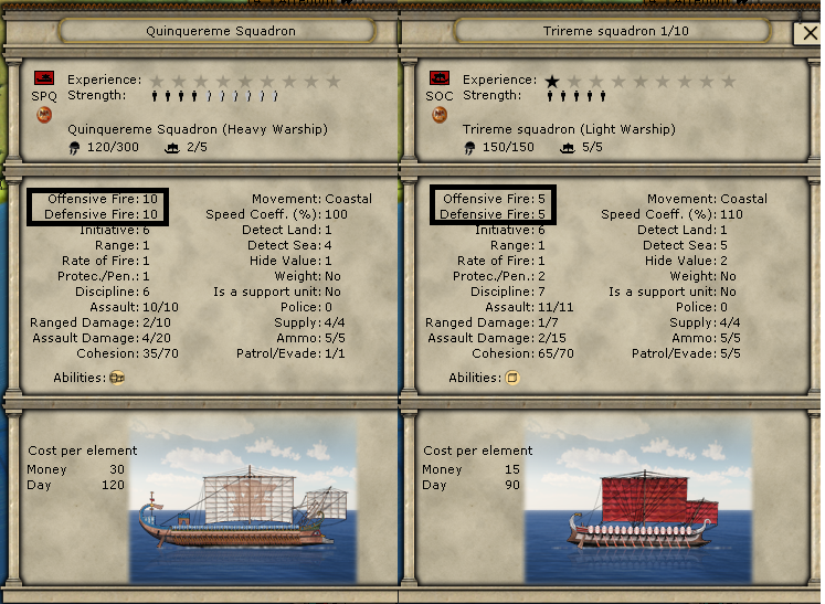 I am beginning to think that it might have been a bad idea to lure him in. Particularly seen how my Trireme was decimated earlier. I also had a look at the relative stats between light and heavy warships. The heavy warships offensive and defensive fire is double that of a light warship.