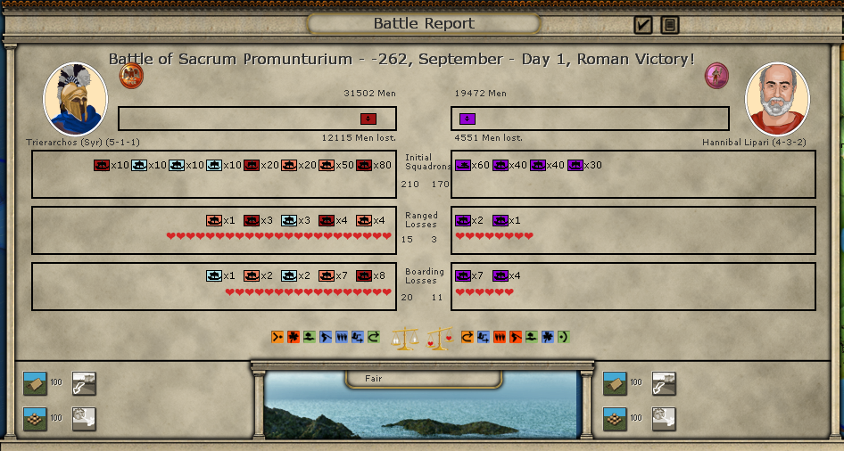 Well the naval battle was pretty epic. I won. But I actually really lost. Badly! I held the field at the end of battle but I suffered by far the greater casualties. I lost about over twice as many elements as Carthage. Carthage lost NO heavy warship elements. I will never again face off against the Carthage fleet without a good backbone of heavy warships.