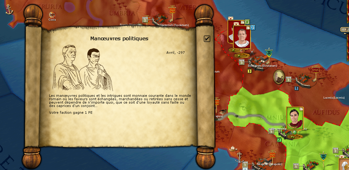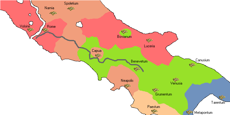 On pouvait imaginer le pire, en voyant Rome encerclés au Nord par les Etrusques, les Ombriens et les Gaulois, au Sud par les Samnites et les Bruttiens. Mais Rome disposait d'une position centrale, avec des Socii fidèles et sûrs, et l'assurance des Lucaniens qui contrôlaient les territoires au Sud de Neapolis. Sans parler que nous avions déjà remportés deux guerres."