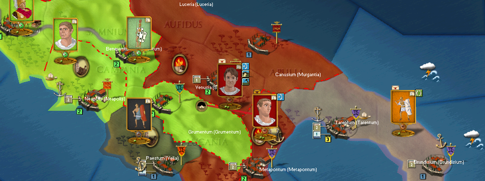"C'est dans ce contexte que la faction démocrate qui tient Tarente depuis quelques temps et qui craint toute intrusion dans sa zone d'influence, envoya aux consuls un avertissement. Tarente disait qu'elle ne pouvait se permettre d'apparaitre comme faible en ces temps troubles. Mais les consuls, ainsi que le sénat, étaient trop occupés par la guerre. Capua était tombée, ainsi que Bovianum. Si la république perdait une cité d'importance stratégique, la prise de Bovianum permit de convaincre les Picentins de rejoindre Rome dans la guerre. Ces derniers levèrent une petite légion dans le Nord, permettant aux consuls d'aller dans le Sud, vers Canusium, afin d'attirer les forces Samnites et éviter qu'ils n'aillent plus au Nord, plus vers Rome."